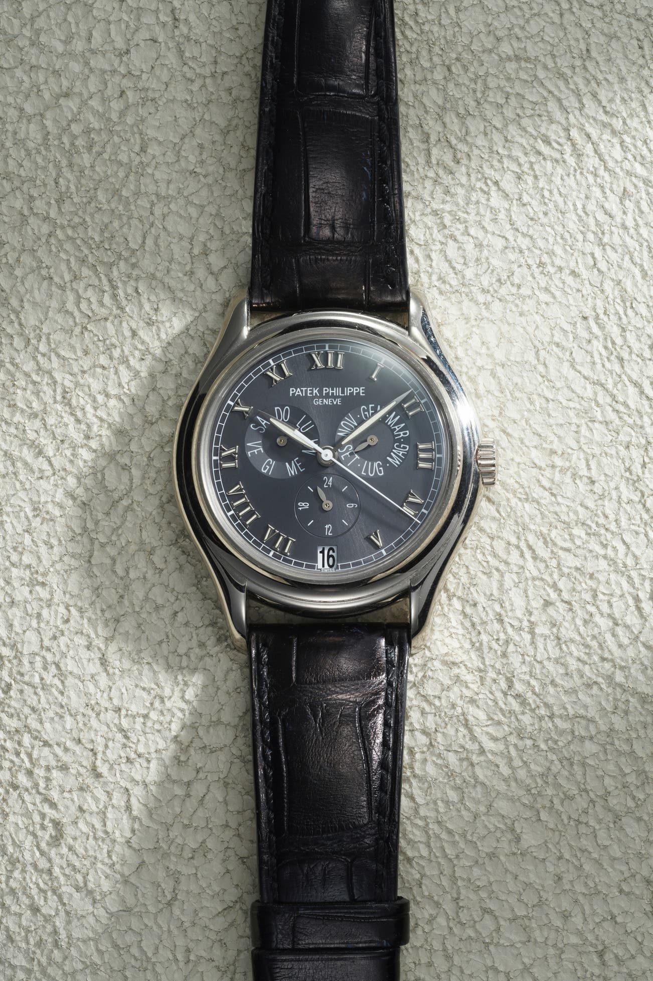 A very fine and attractive white gold annual calendar automatic wristwatch with slate grey dial, center seconds, 24-hour indication and presentation box