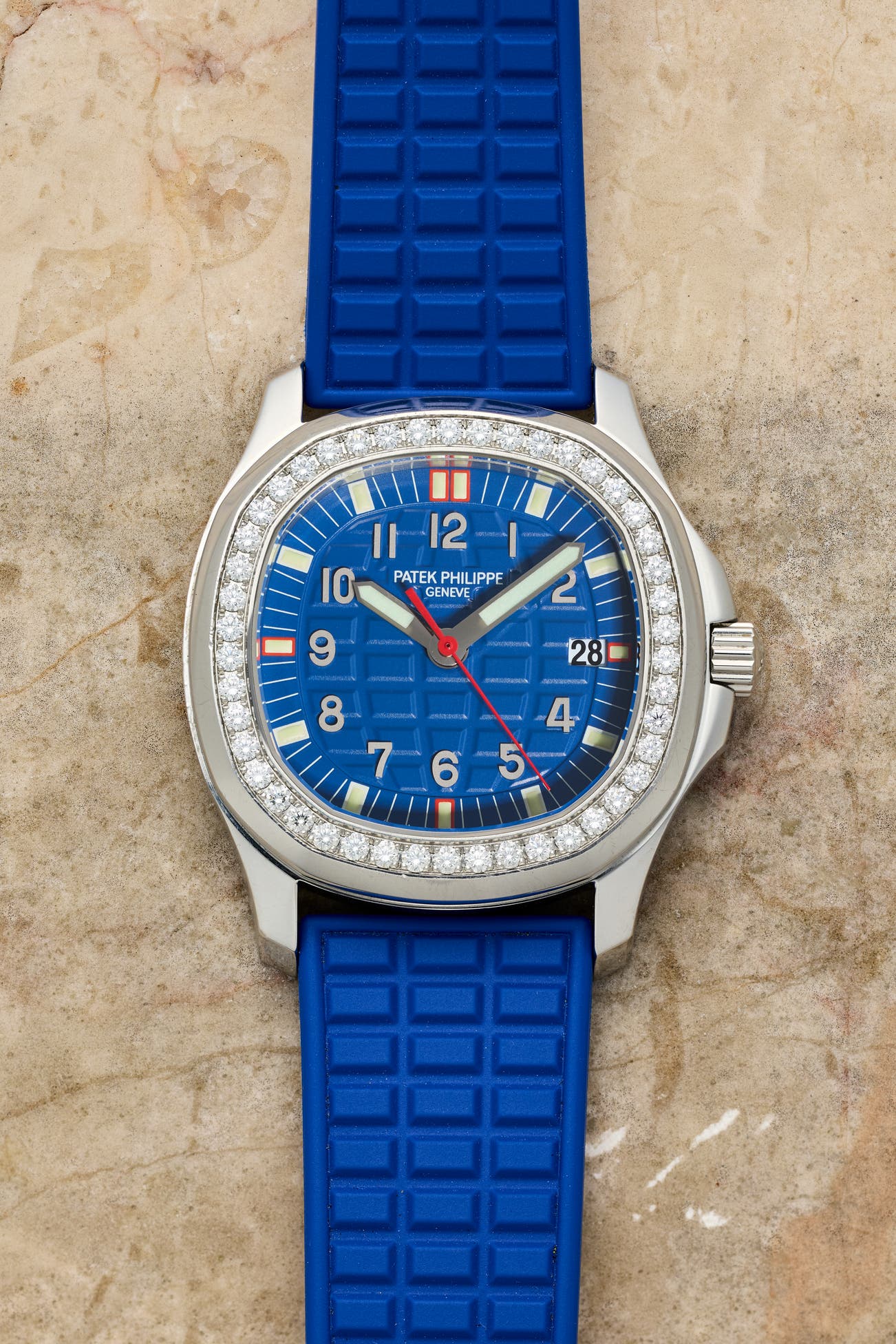 • The present ref. 5067A is a stainless-steel Aquanaut “Luce”, boasting a bold and brazen electric blue “grenade” dial, contrasted with bright red accents in the seconds hand and quarter-markers. Housed in a 35.6mm stainless steel case, the diamond-set bezel truly brings the watch to life and accentuates its sporty elegance. Concealed beneath its solid screw-down case back is the cal. E23 SC, a reliable in-house quartz movement.