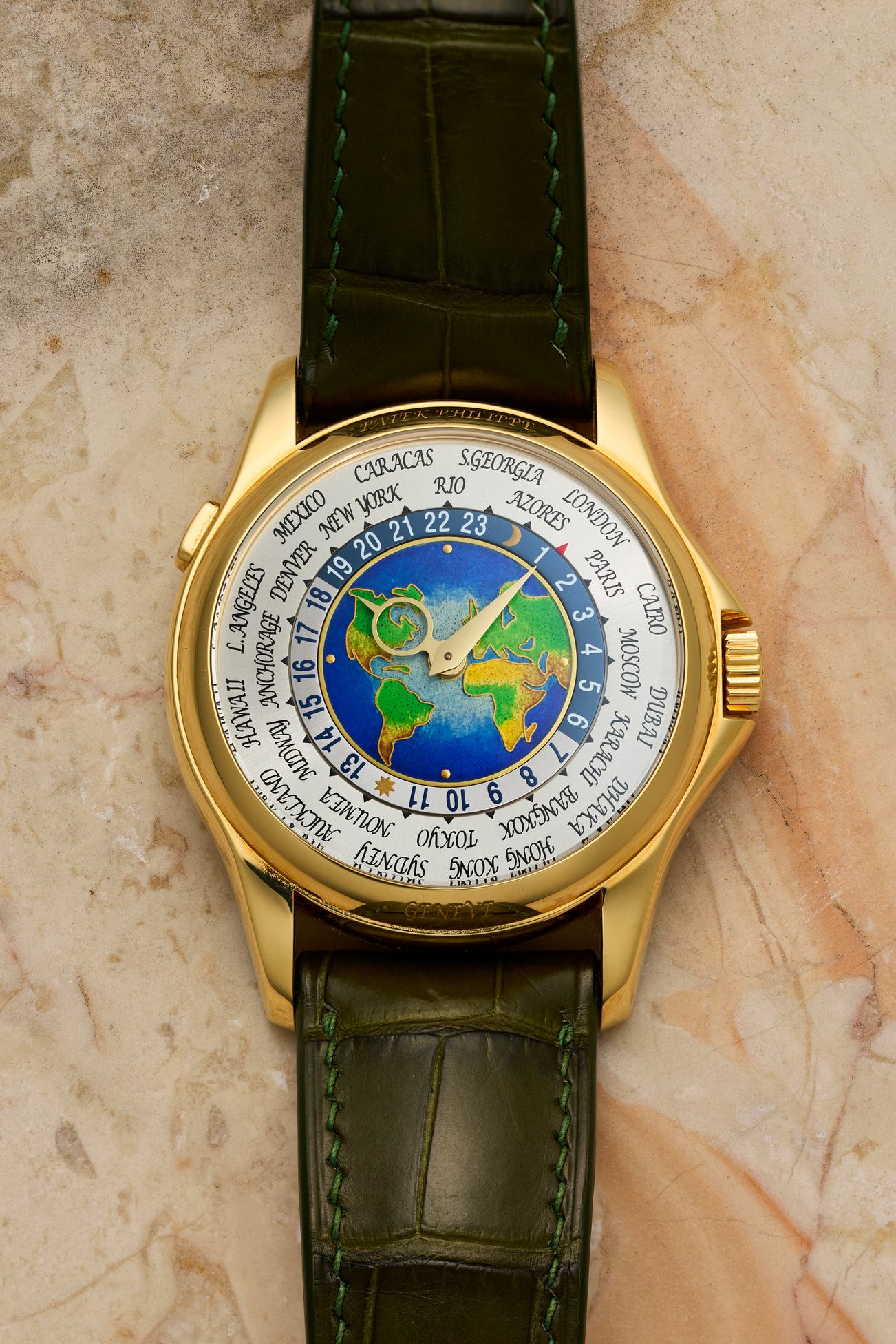 • The cloisonné enamel dials demonstrate the quality and craftsmanship of Patek Philippe enamel work that the brand is known for. This yellow gold example features a stunning dial with the Americas, Europe, and Africa.