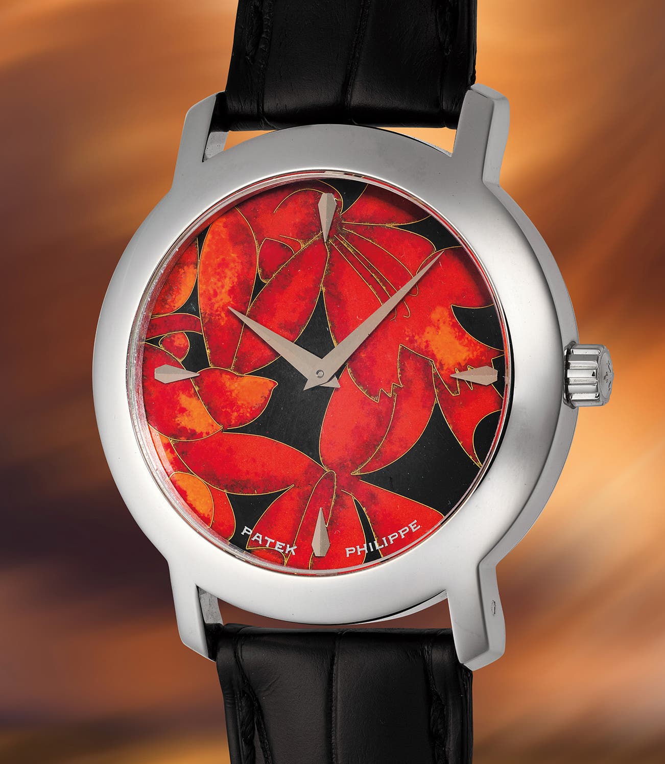 The present watch depicts the flower “Epidendrum Ibaguense”, sometimes called the crucifix orchid or fiery reed orchid. These flowers come in an array of colors, though Patek Philippe chose to use the red variant. The Latin name comes from the city of Ibagué in Colombia, where the species was first observed and catalogued.