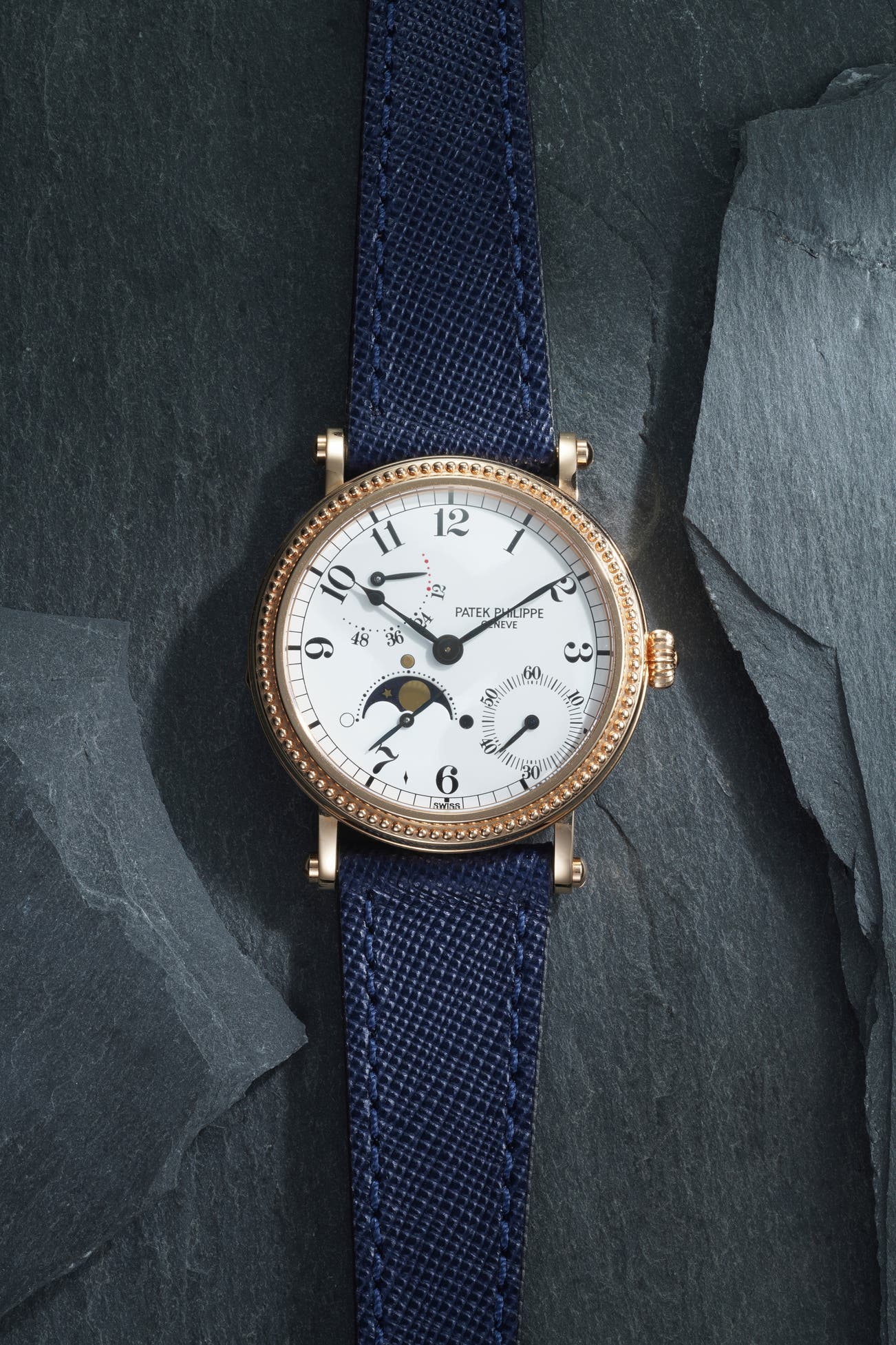 - The reference 5015 is the only Patek Philippe from the time to feature an "age of the moon" indicator which displays the exact time of the full moon. This watch also features an officers style case back which houses the beautiful cal. 240.Elegantly decorated with a small beaded bezel, the present ref. 5015 in pink gold has been in this private collection for many years.
