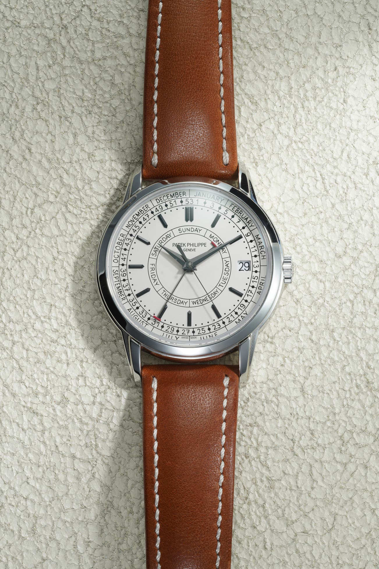 - The five centrally mounted hands create a harmonious visual appeal that balances all the displayed information. Unlike Patek Philippe's traditional designs, the calendar features a completely new typography, with the font based on the handwriting of one of the brand's designers, lending a unique touch to this exceptional timepiece