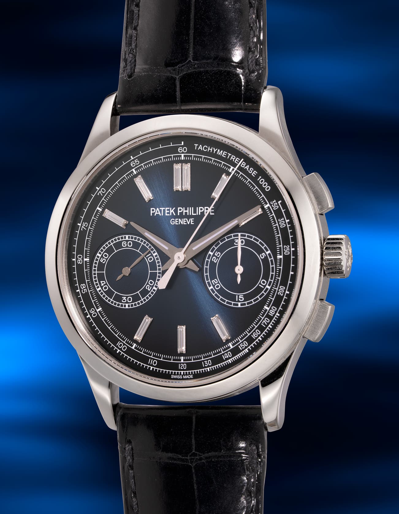 An attractive and rare platinum chronograph wristwatch with baguette diamond indexes, blue “fume” dial, Certificate of Origin and presentation box