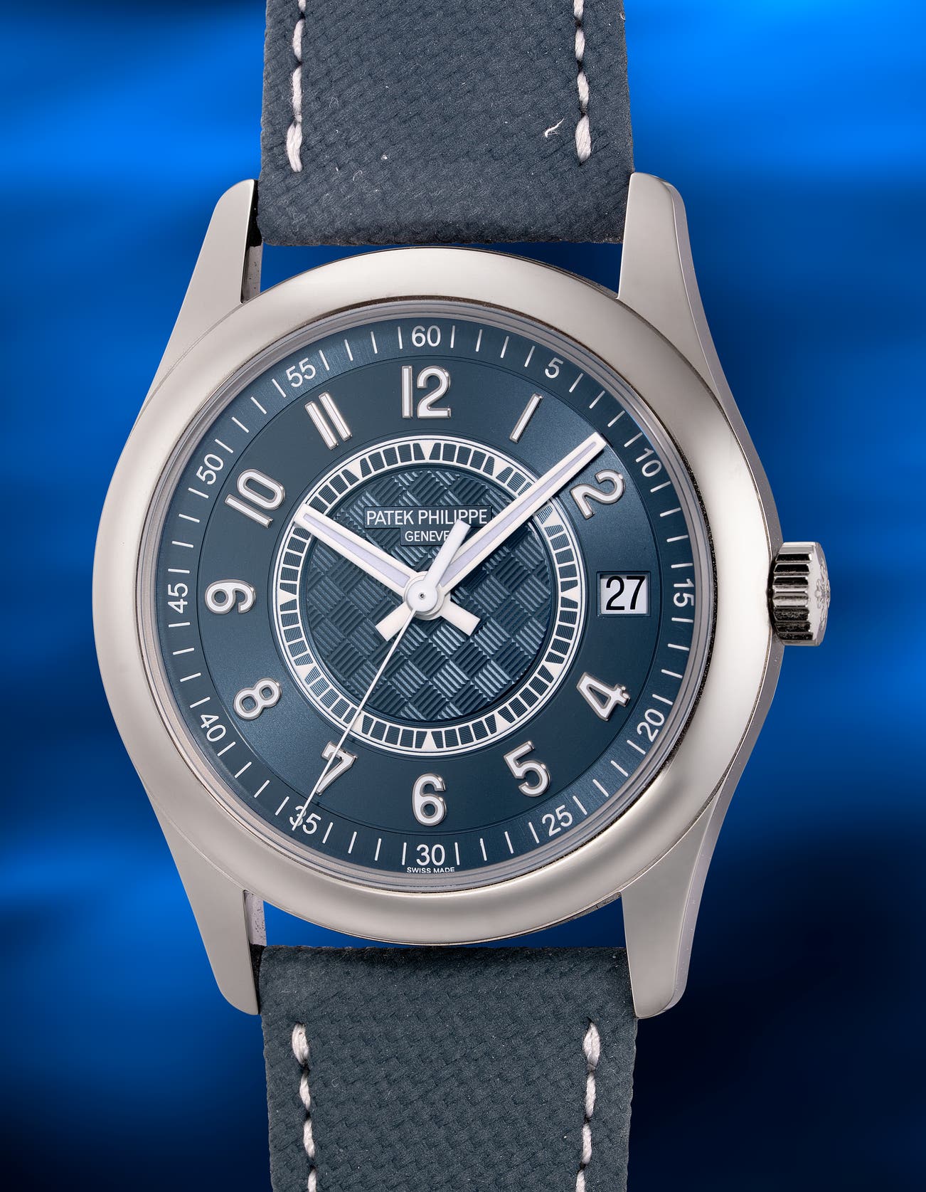 - Limited to just 1,000 pieces, the Calatrava ref. 6007A stands out as a particularly compelling expression of the collection, not least for its rare execution in stainless steel. Highly regarded by collectors, the watch is distinguished by its striking multi‑finished blue dial. A carbon‑textured central surface anchors the design, subtly contrasted by satin‑finished chapter rings in varying shades of blue, creating depth and visual intrigue. Applied white‑gold Arabic numerals and luminous hands, ensure excellent legibility while maintaining a clean, contemporary aesthetic.