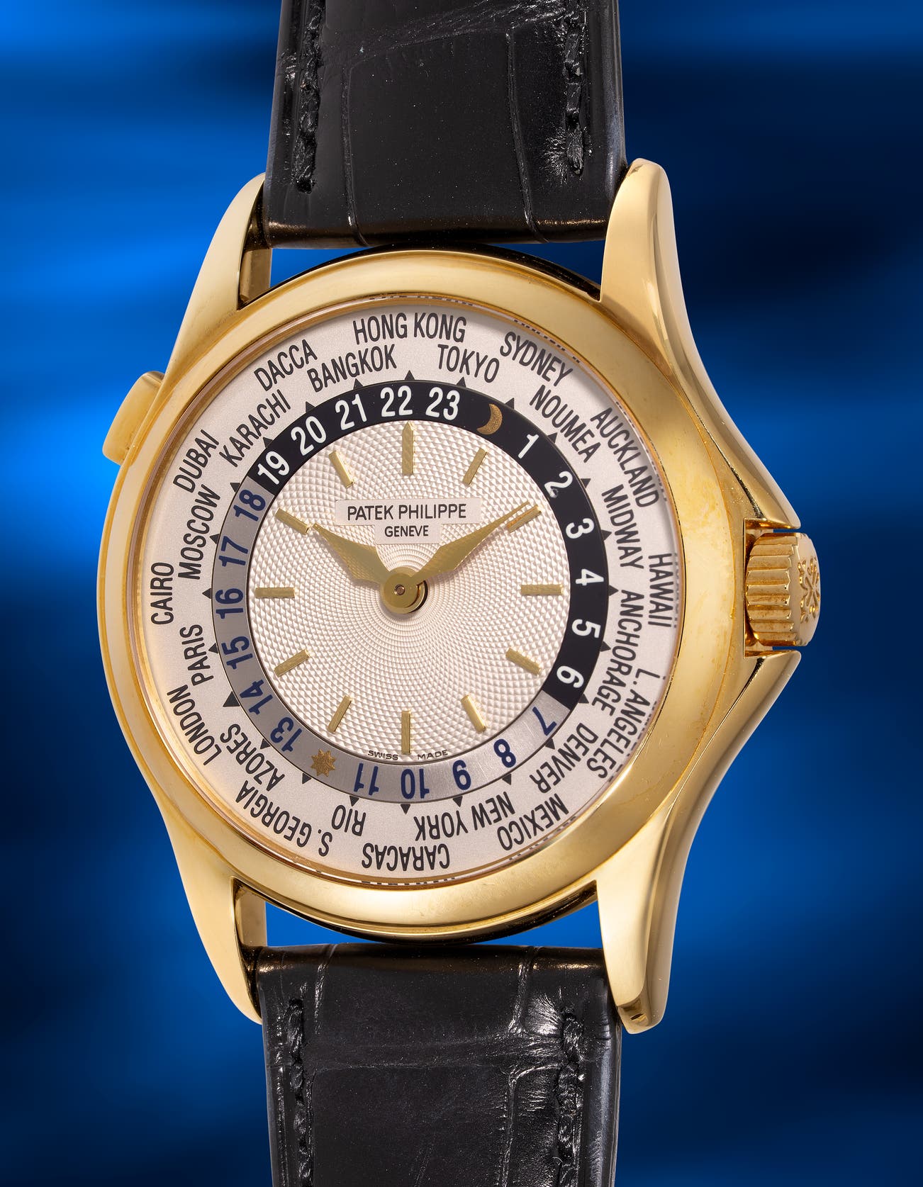 - Fast forward to the year 2000, and Patek Philippe finally introduced another serially produced World Time reference, incorporating notable upgrades from its predecessors. Instead of featuring an additional crown for setting the local city, this new patented mechanism allows the wearer to set the local time zone with a gentle push. The guilloché pattern on the dial further enhances the depth and sophistication of the watch, creating a mesmerizing visual appeal. The reference 5110 was produced across yellow, pink, white gold and platinum.