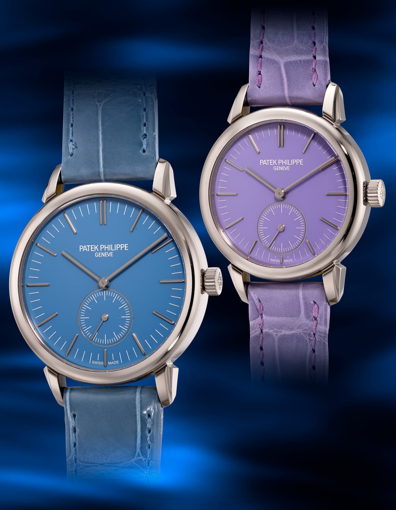 A pair of rare limited edition white gold wristwatches with small seconds, blue and violet dials, Certificates of Origins and presentation box, made exclusively for the Japanese market for the Patek Philippe Watch Art Grand Exhibition Tokyo