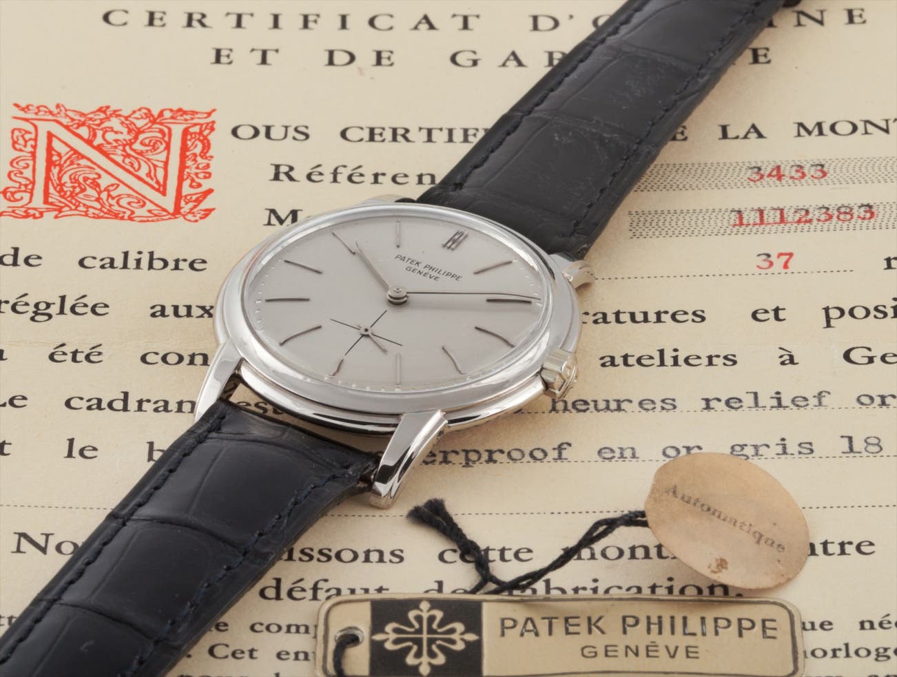 The present white gold example of reference 3433, one of only three known today, can offer some help as it is not only preserved in excellent condition but, quite remarkably, has still its original certificate and even the hand-numbered hanging tag.