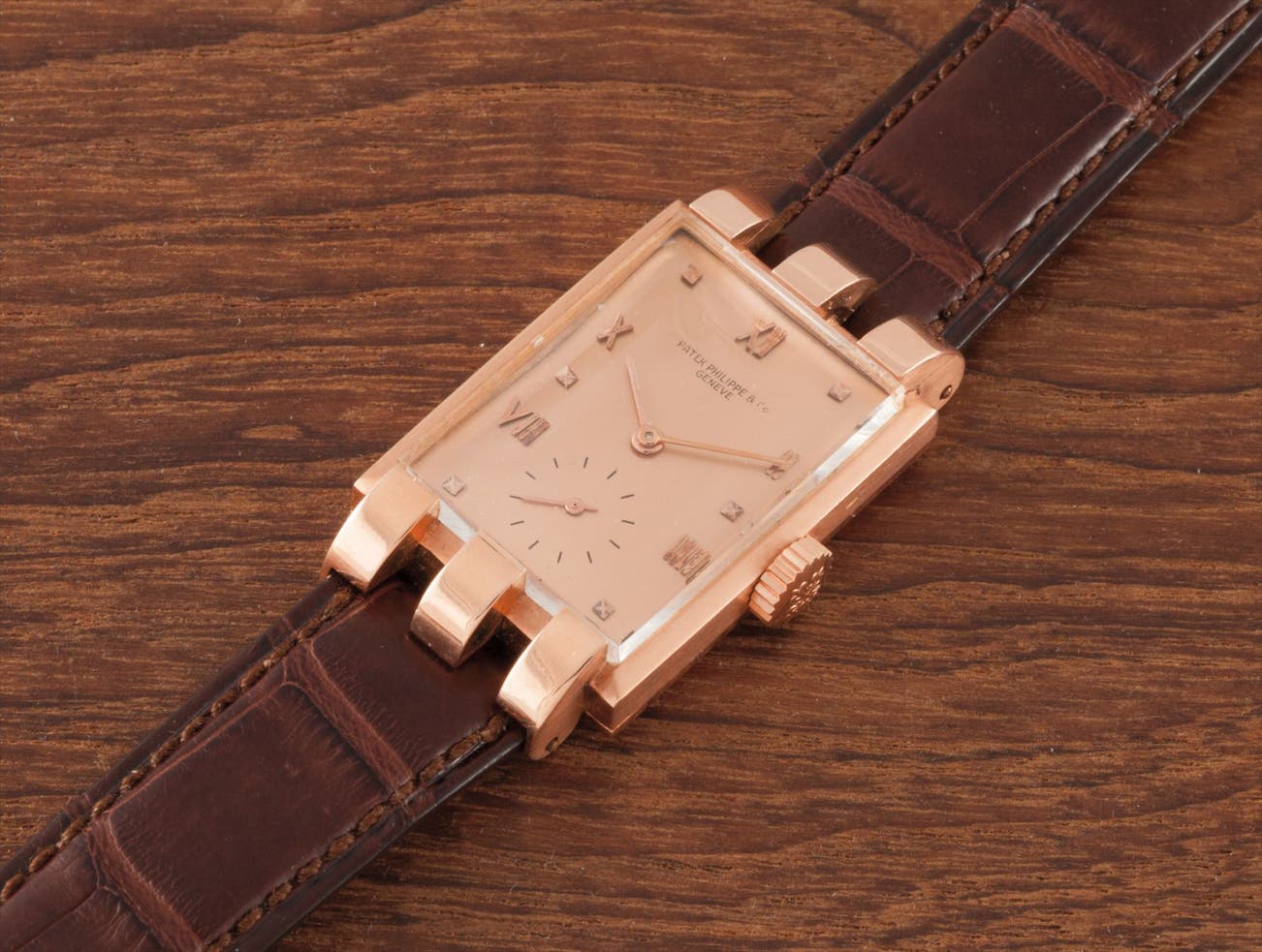 A very rare and attractive pink gold wristwatch with pink dial and fancy lugs