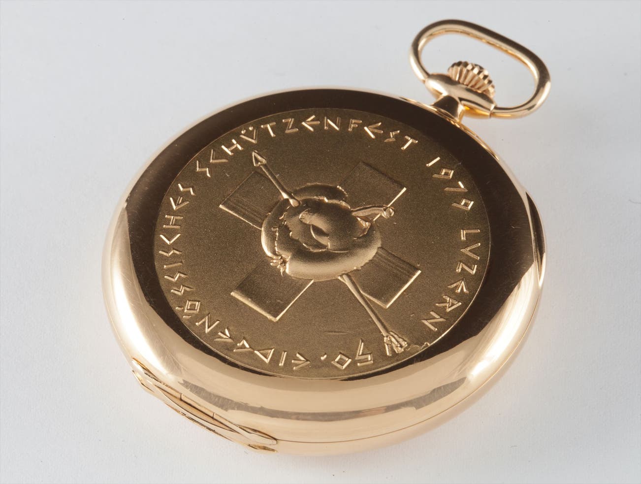 This particular watch was made in a limited edition of 100 examples to commemorate the anniversary of the Swiss Federal Target shooting festival in Lucerne, Switzerland, and features the famous story of William Tell shooting the apple embossed in high relief, designed and signed by the celebrated artist Hans Erni.