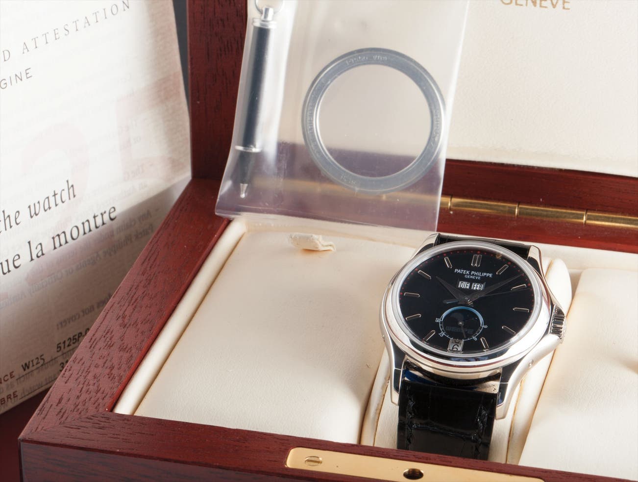 A fine and rare limited edition platinum annual calendar wristwatch with centre seconds, moon phases and 24 hour indication, certificate of origin, additional case back, setting pin and box, made to commemorate the 125th Anniversary of Wempe Jewellers