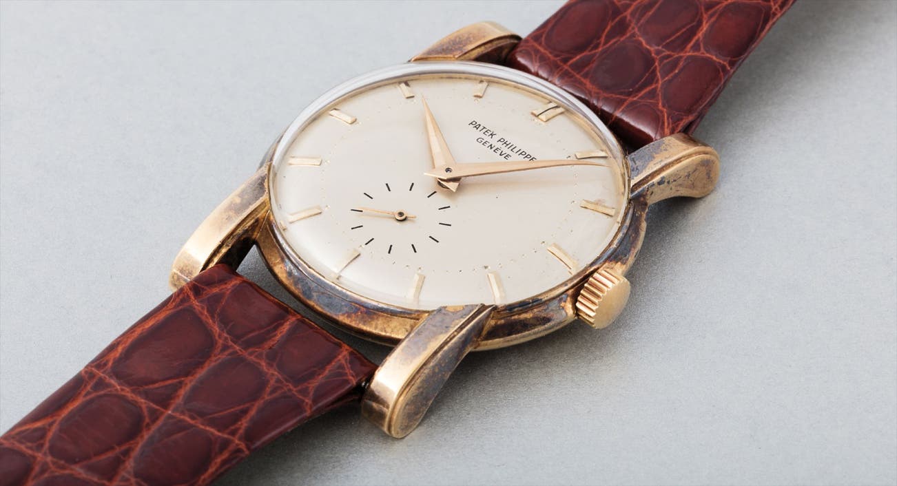 Reference 2428 is defined by its stepped broad, rectangular lugs with a downturned curve. Applied yellow gold baton hour markers complement the silver satin-finished dial with a subsidiary dial at 6 o’clock for constant seconds. The case shows pleasing signs of oxidation with tones of blue, purple, and copper. It is fitted with the calibre 10-200 manual-wind movement, stamped with the seal of Geneva certifying its exceptional quality.