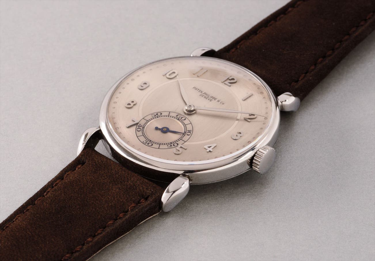 The only two tone dial with full Arabic numerals known to date, the dial of the present watch is a work of art, with three separate textured zones: an outer ring with satin finish, an inner ring with a matte finish, and a circular ring with mirror finish between the two. The original dial is nicely aged and enhanced by the presence of the highly sought after comma between the words “Patek” and “Philippe”, as well as the accent on the word “Genève”, lending credence to its overall originality. The stainless steel case is in excellent condition with well-defined teardrop lugs. Demanding collectors will appreciate the present wristwatch for its modern size, stunning charisma, and unparalleled attractiveness. This is a wonderful, classic example of a stainless steel Patek Philippe featuring a unique dial, and a must have for any collection.