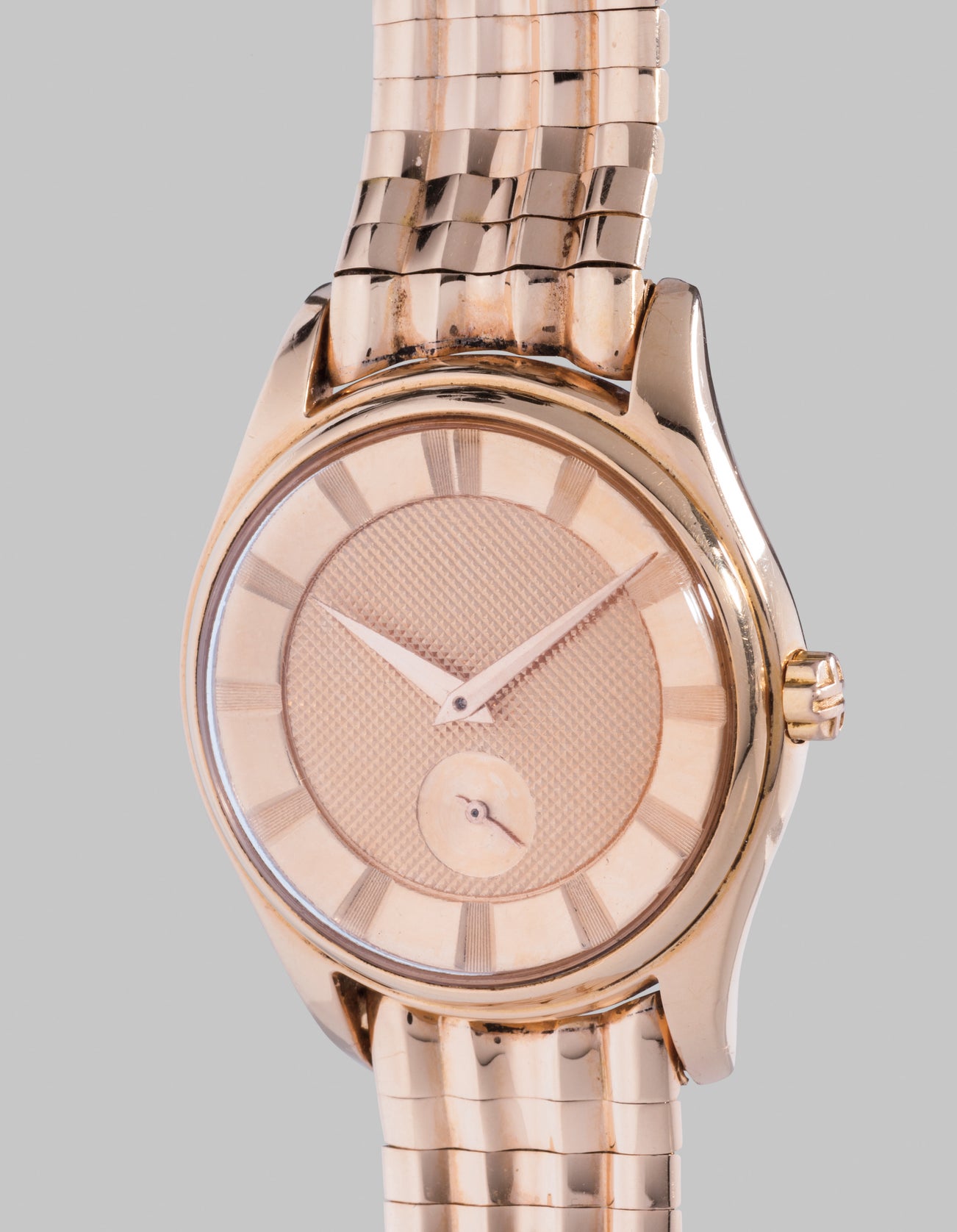 The present watch is in many ways an outstanding example of the reference 2526. Firstly, the watch is cased in pink gold, which is much rarer to come by than its yellow gold counterparts. Featuring a luxurious and fluid pink gold bracelet stamped for the second quarter of 1956 and manufactured by Gay Frères, the watch is incredibly heavy. Yet, what truly sets this watch apart from its contemporaries is the pink gold dial, embellished with a Clous–de-Paris guilloché design. In lieu of numerals is an outer ring with a threaded design to appear like baton markers. Most strikingly, the dial is not signed. However, the case back bears Patek Philippe's signature - an incredibly unusual feature which is not typically found on the reference. One can only conclude the present watch was made upon special order, and designed to the client's specifications.