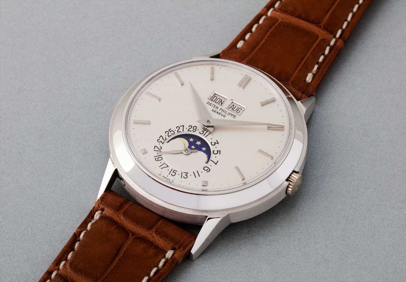 The present white gold "Padellone", the nickname given to the reference 3448 by Italian watch collectors, is a premium example of this timeless model. One of the later models of the reference, it features elements of the late 1970s production run, most notably, a scratch-resistant sapphire crystal. It is blessed with several other attributes making it stand out from the larger field of references 3448. The day and month indicators of the calendar are displayed in German – a rare configuration. Never having appeared before at auction, this watch was part of a distinguished private collection for many years, where it was treated with utmost care and respect. An ultimate dress watch for a gentleman, the present lot is a rare opportunity for connoisseurs of complicated Patek Philippe wristwatches.