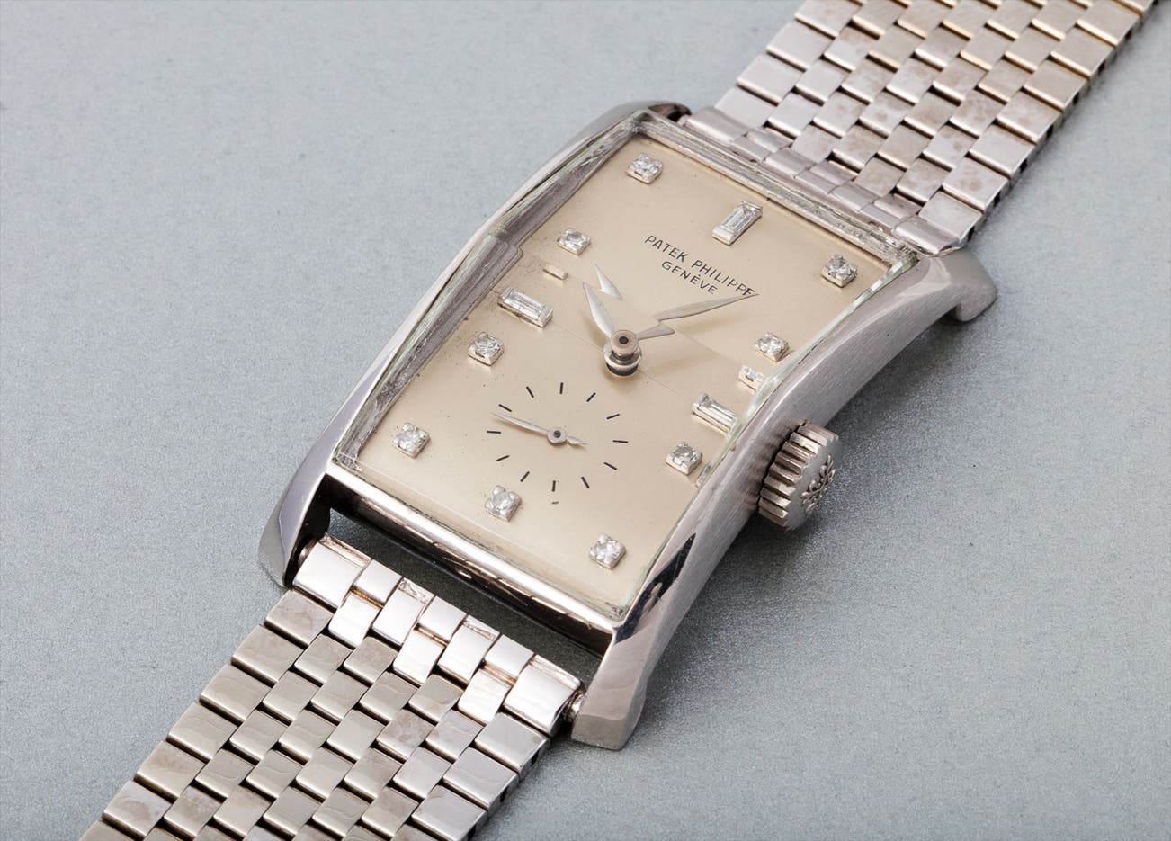 The reference 1593 is considered by many to be among Patek Philippe’s best rectangular-shaped wristwatch designs. The beautiful silvered matte dial with raised enamel print is accented with diamond hour markers, encased in a rarely seen platinum case. The savvy collector will appreciate the diamond hour markers that are confirmed by the Extract from the Archives.