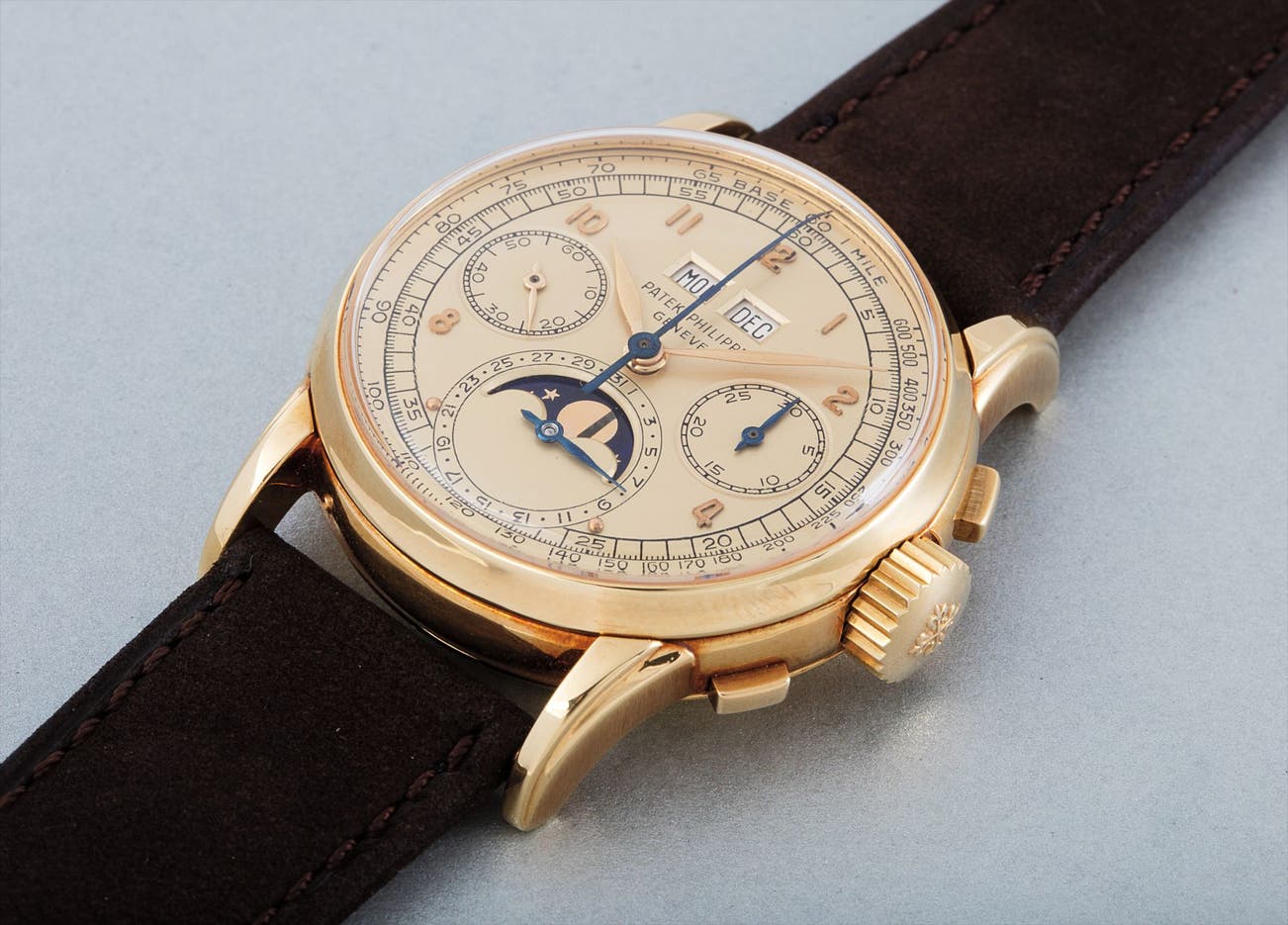 An extremely rare and highly important yellow gold perpetual calendar chronograph wristwatch with moon phases and champagne-colored dial