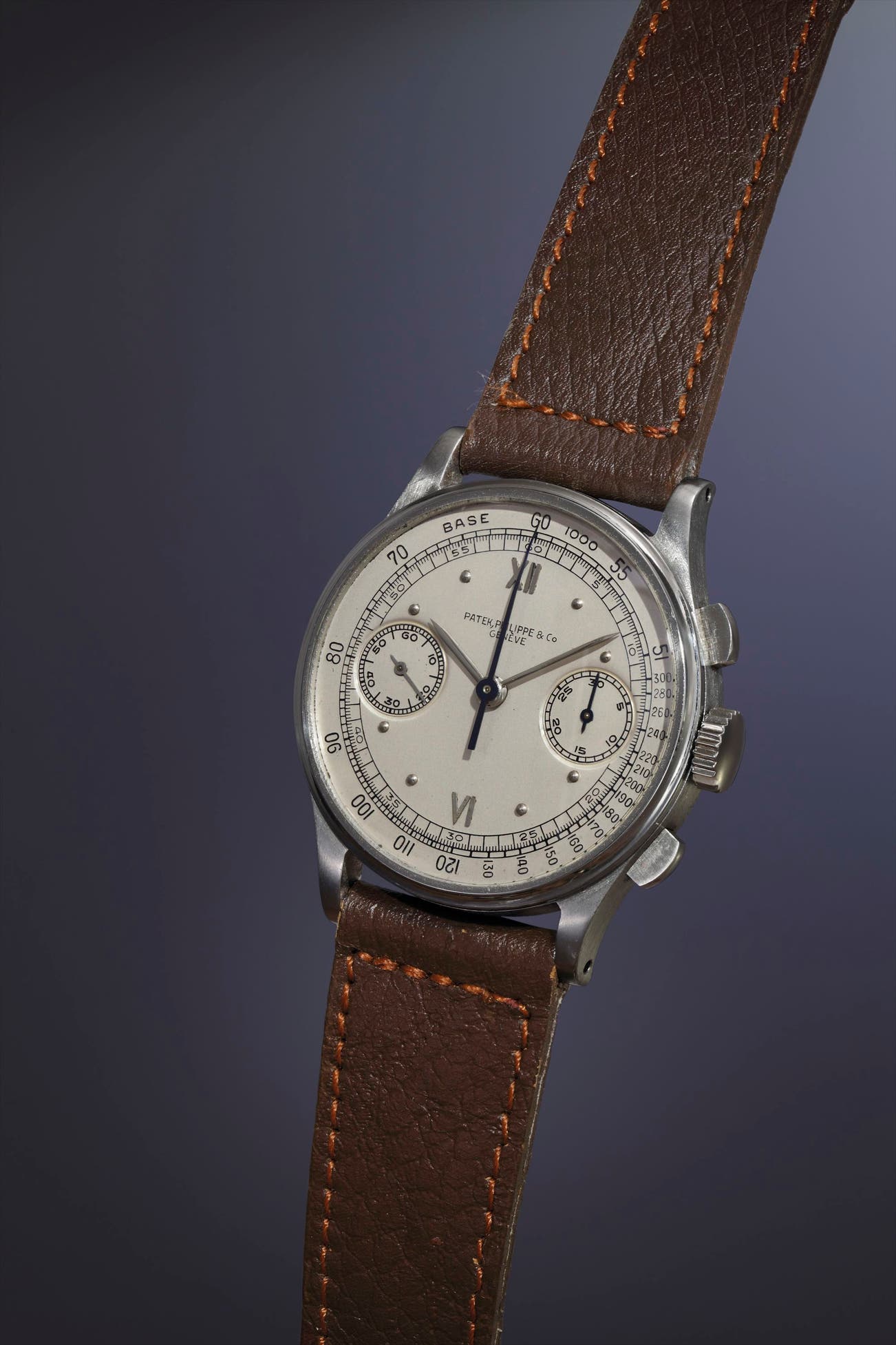 The present example in stainless steel has a silvered dial with applied Roman and dot hour markers, a classic combination for the 1940s that is highly sought after amongst collectors. As one would expect for a watch made in 1941, the dial features the long signature, Patek Philippe & Co., in hard, raised enamel, along with all printing present on the dial.