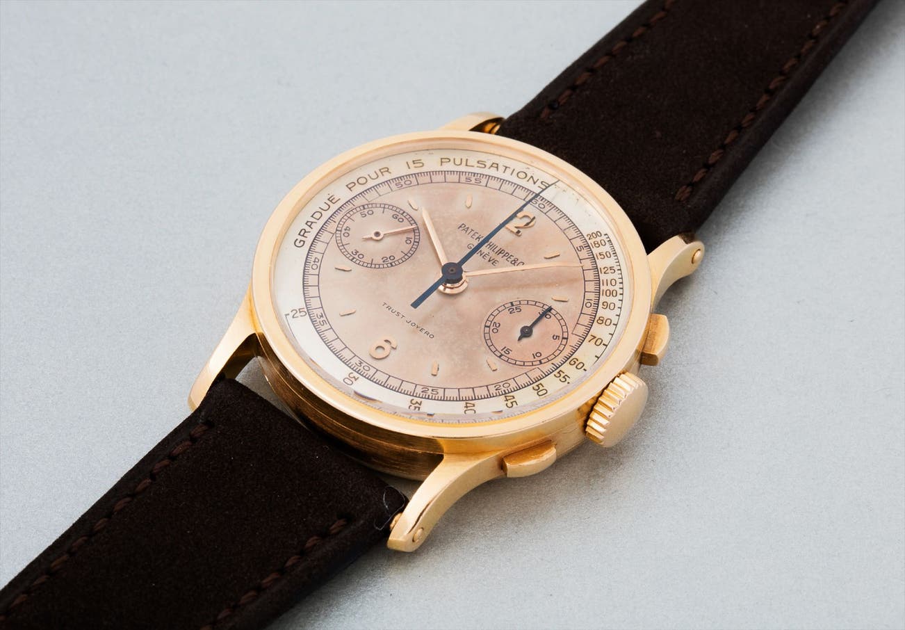 The present lot is fresh to the market, and will further speak to collectors with its spectacular, two-tone pulsation dial with a beautiful rose color patina at its center, and rare retailer signature. The pink gold case is in remarkable condition, with strong and crisp hallmarks, and only minor signs of having been worn gently over the past nearly 70 years.