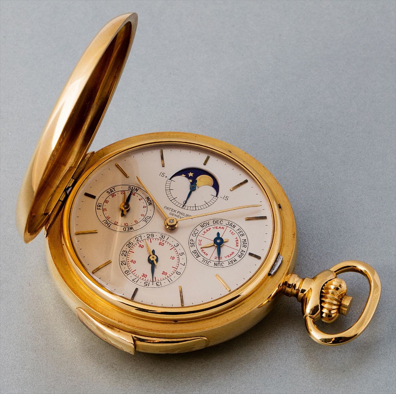 An extremely rare and important yellow gold hunter-cased minute repeating perpetual calendar watch with phases of the moon, equation of time and AM/PM indicator, retailed by Beyer/Zurich