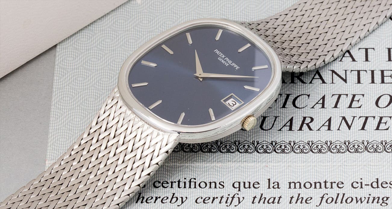 The Golden Ellipse is a model characterized by its visually attractive balance. The rounded rectangular shape case was designed using the famous “golden ratio”. Used by artists around the world since the Renaissance, this mathematical ratio can be found in the most beautiful architectural monuments and used for the world’s most famous paintings. Produced from 1971 to 1984, reference 3605 was the largest Ellipse model ever made by Patek Philippe and was certainly the inspiration for the newly released reference 3738/100J. Another interesting fact is that this watch and the legendary Jumbo Nautilus, reference 3700 share the same caliber, the ultra-thin 28-255C. The present reference 3605-1 with its blue sunburst dial and supple, woven gold bracelet is one of only 11 pieces known to date to the market. Preserved in incredible condition and accompanied with its original box and certificate, it is undoubtedly one of the best examples a collector could hope to find of this landmark model.