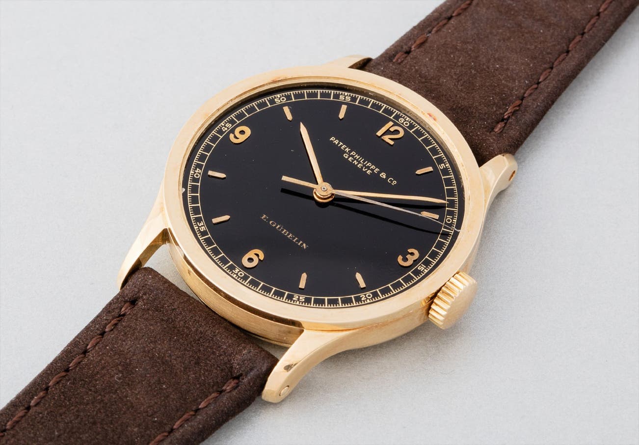 The stand out feature, however is its extraordinary black lacquered dial, beautifully accented with yellow gold applied Arabic and baton hour markers and the prestigious E. Gübelin retailer signature at 6 o’clock. Scholarship tells us that only six examples of reference 570 with the 12’’’ mechanical movement are known, further enhanced by the extraordinary dial combination that is most probably unique. Appearing now from one of the most distinguished collections of rare Patek Philippe wristwatches, it has an immaculate pedigree and wonderful documentation. In fact the archives of Patek Philippe not only confirms that the incredible black dial is original to this watch but also implies that it was a special order.