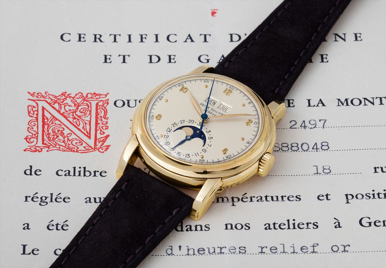 In 1951, reference 2497 was first introduced slightly earlier than its water-resistant equivalent, the reference 2438/1. Due to their balanced symmetry, spectacular curves, and large case sizes, they are considered by many to be one of the most beautiful perpetual calendar wristwatches ever made.