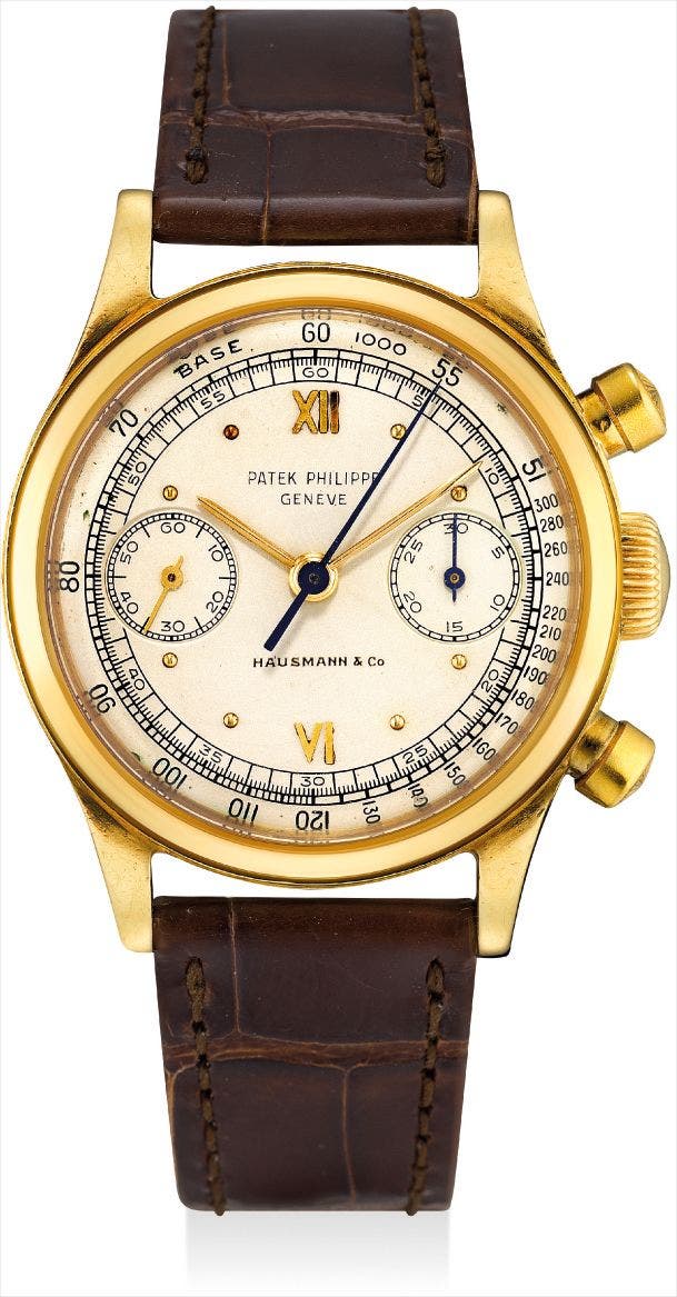 This particular example features a railway track to the outer tachymeter, also known as chemin de fer, along with Roman numerals at 12 and 6 o'clock. The most distinguishing feature of the present watch, is without a doubt, the 'Hausmann & Co' signature above 6 o'clock. Founded in Rome in 1794 by Ernst Hausmann and Hermann Frielingsdorf, Hausmann & Co. is one of Patek Philippe's most prominent retailers in Italy. Only the most select and prestigious retailers have the honor of printing their dials on Patek Philippe's watches. The present example is further retained in very original condition with correct hallmarks, proportions and thickness of the lugs.