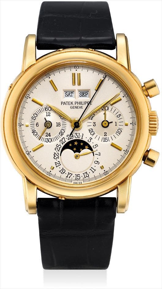 A fine and very rare yellow gold perpetual calendar chronograph wristwatch with moon phases, 24 hours, leap year indicator, sapphire crystal case back, original certificate and additional case back
