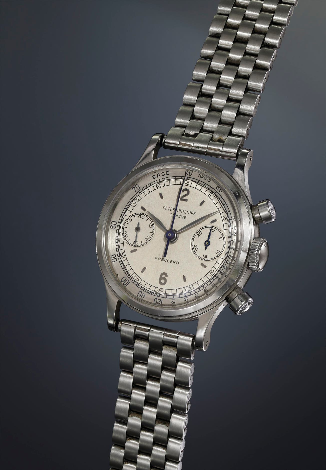 The majority of the acclaimed “Tasti Tondi”, Italian for “round pushers” were cased in yellow gold, with a small number cased in steel and rose gold. For collectors of the finest timepieces, the retailer’s signature of “Freccero” is an added treat for this already rare piece. Freccero & Cia was a prestigious retailer of Patek Philippe watches from Montevideo in Uruguay. This watch is the only example known in stainless steel with applied white gold baton and Arabic hour markers to feature the “Freccero” designation on the dial. The magnificent example presented here comes not only in extraordinary condition, but its dial is also confirmed by the Extract from the Archives.