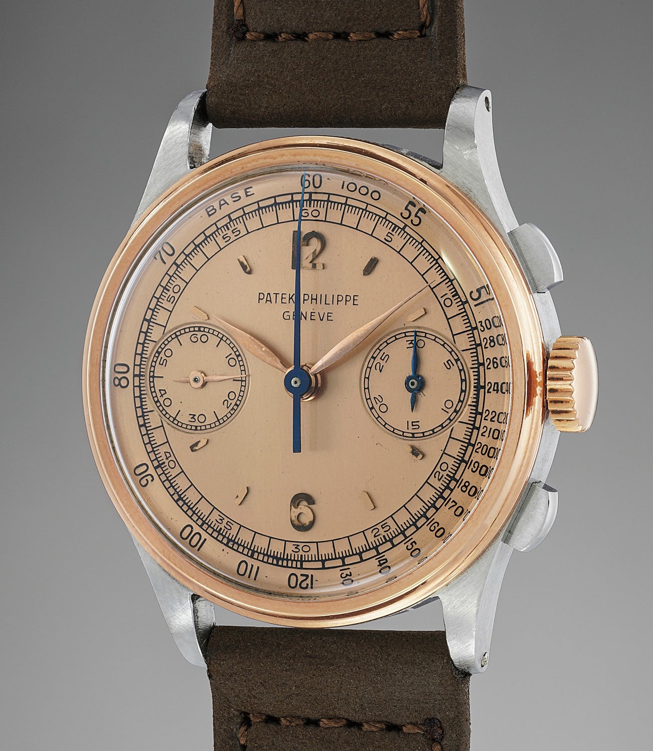 An extremely fine and rare stainless steel and pink gold chronograph wristwatch with two-tone pink dial