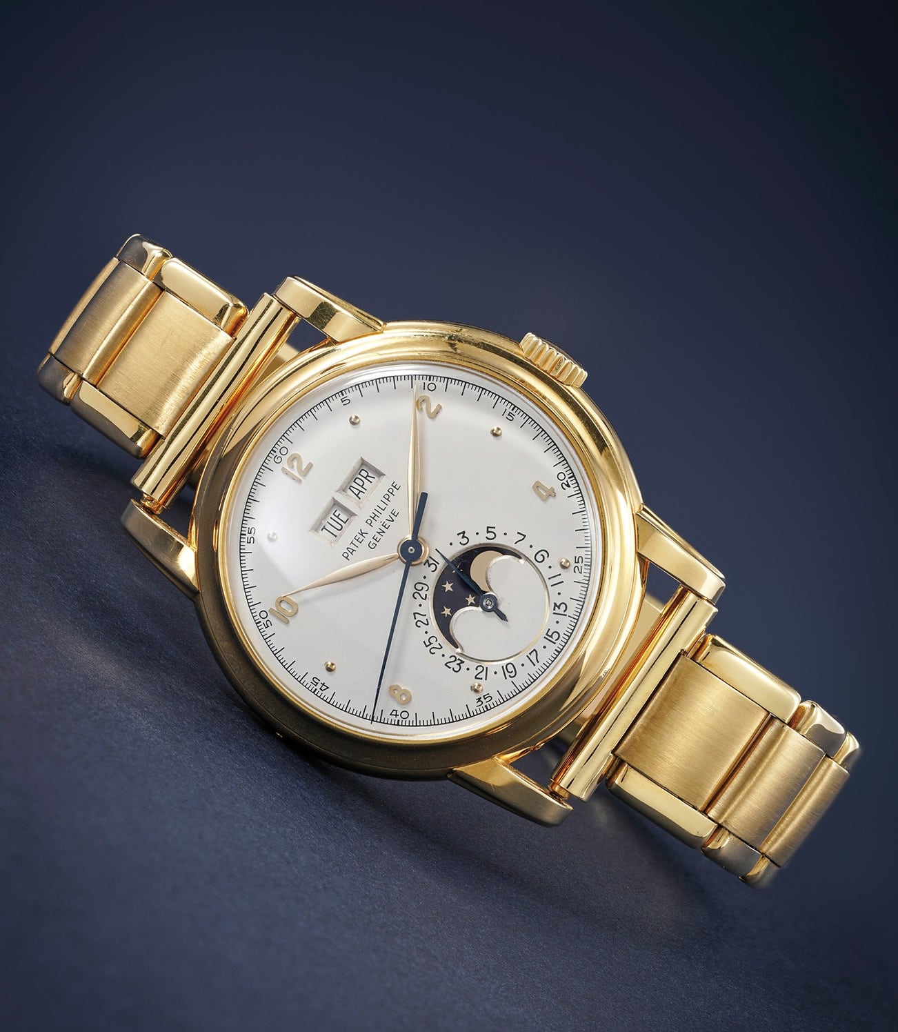 A very rare and incredibly well-preserved yellow gold perpetual calendar wristwatch with center seconds, moonphases and bracelet