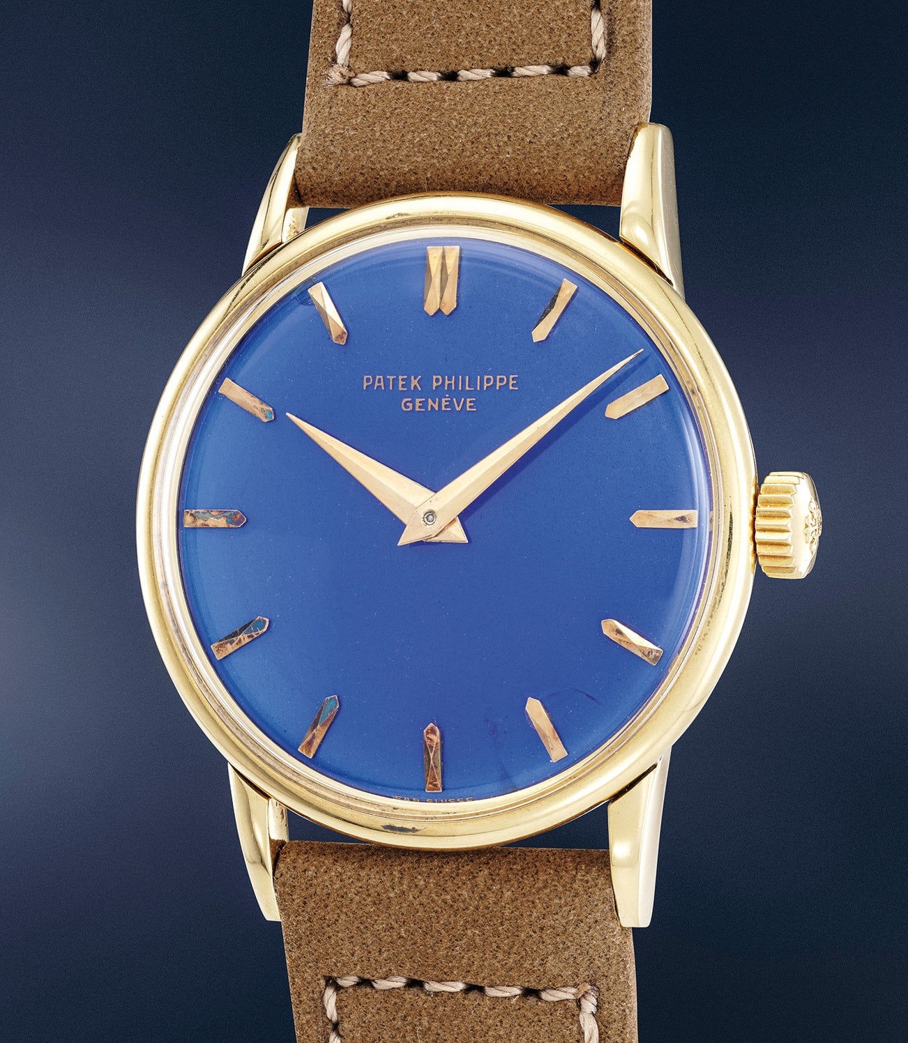 Already a very rare reference in its standard metal-dial configuration it is the first time an enamel dial specimen has come to the market, thus rewriting what is known about this model. The translucent ocean blue tonality of this enamel - absolutely confirmed by the archives - has been seen before on a handful of Patek Philippe timepieces (most notably, five examples of world time reference 2523 feature a similarly coloured enamel dial). None of these other watches, however, features the same physical size of this dial measuring 28mm across. The present watch offers a fully enamelled area of more than 6 square cm (615 square mm), a simply enormous size compared, for example, to the enamel décor of reference 2523, which has a diameter of about 11.85mm and an area of about 1.1 square cm (110 square mm) which is six times smaller.
