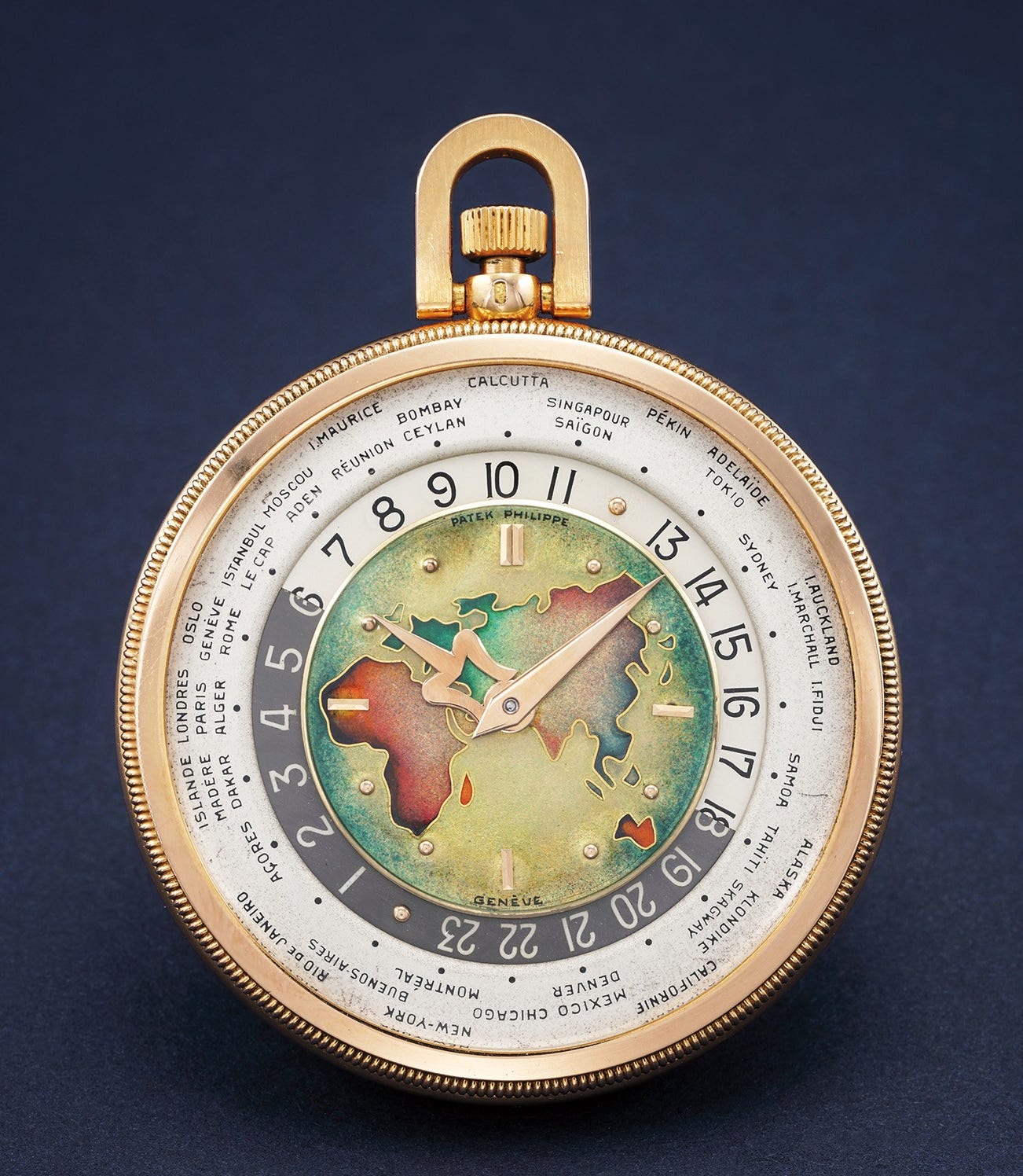 A previously unknown and most probably unique pink gold open face worldtime pocketwatch with cloisonné enamel dial depicting a map of Europe, Asia, Africa