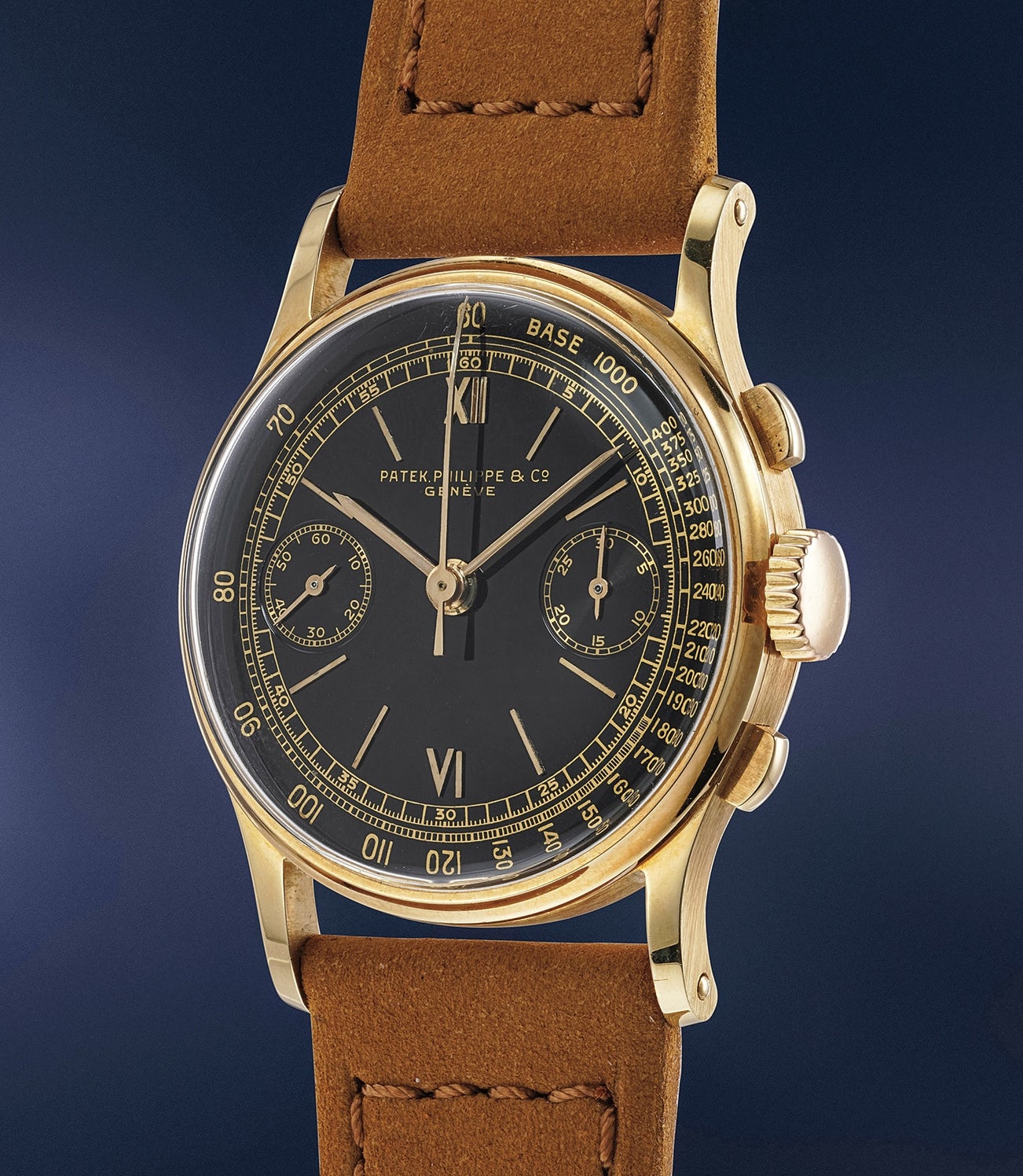 The present example first appeared on the market in 1989 with a black dial but with incorrect short signature and without tachometer scale and reappeared on the auction market in 2013 with the present correct dial featuring long Patek Philippe & Co (as the watch was produced in 1942) signature and tachometer scale, as confirmed by the Patek Philippe Extract from the Archives. The latter is very well preserved incredible to look at with its galvanic gilt signature and deep black glossy surface .