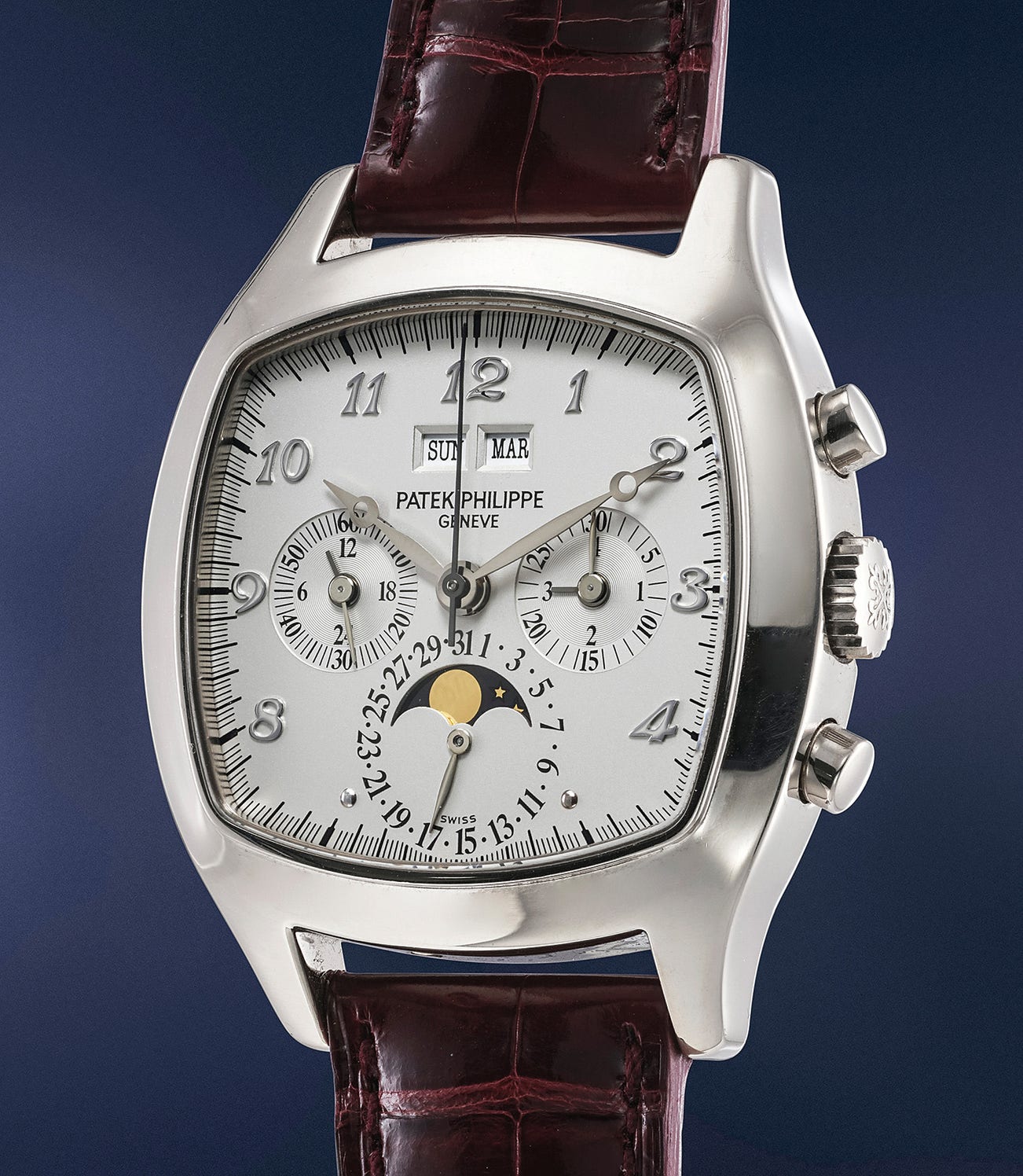 A very rare and attractive white gold perpetual calendar chronograph wristwatch with moon phases, additional caseback and setting pin