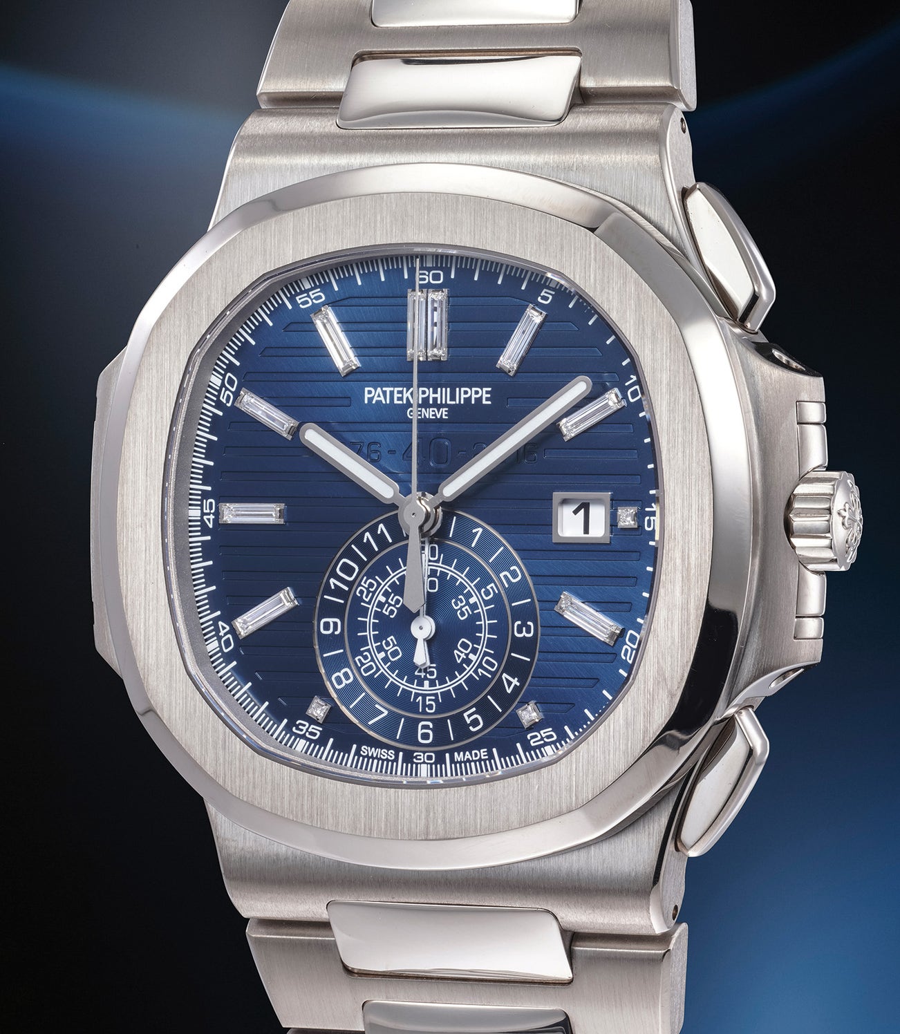 It features a flyback chronograph, date, and diamond-set hour markers – housed within an enlarged case. At 44mm, it is so far the largest in the Nautilus family and, combined with the commemorative dial, renders the model a sight to behold, and in the literal sense. Only in real life one can appreciate the true subtle hue of the dial, feel the weight of the object, wear it and realize that despite its size the watch manages to remain elegant.