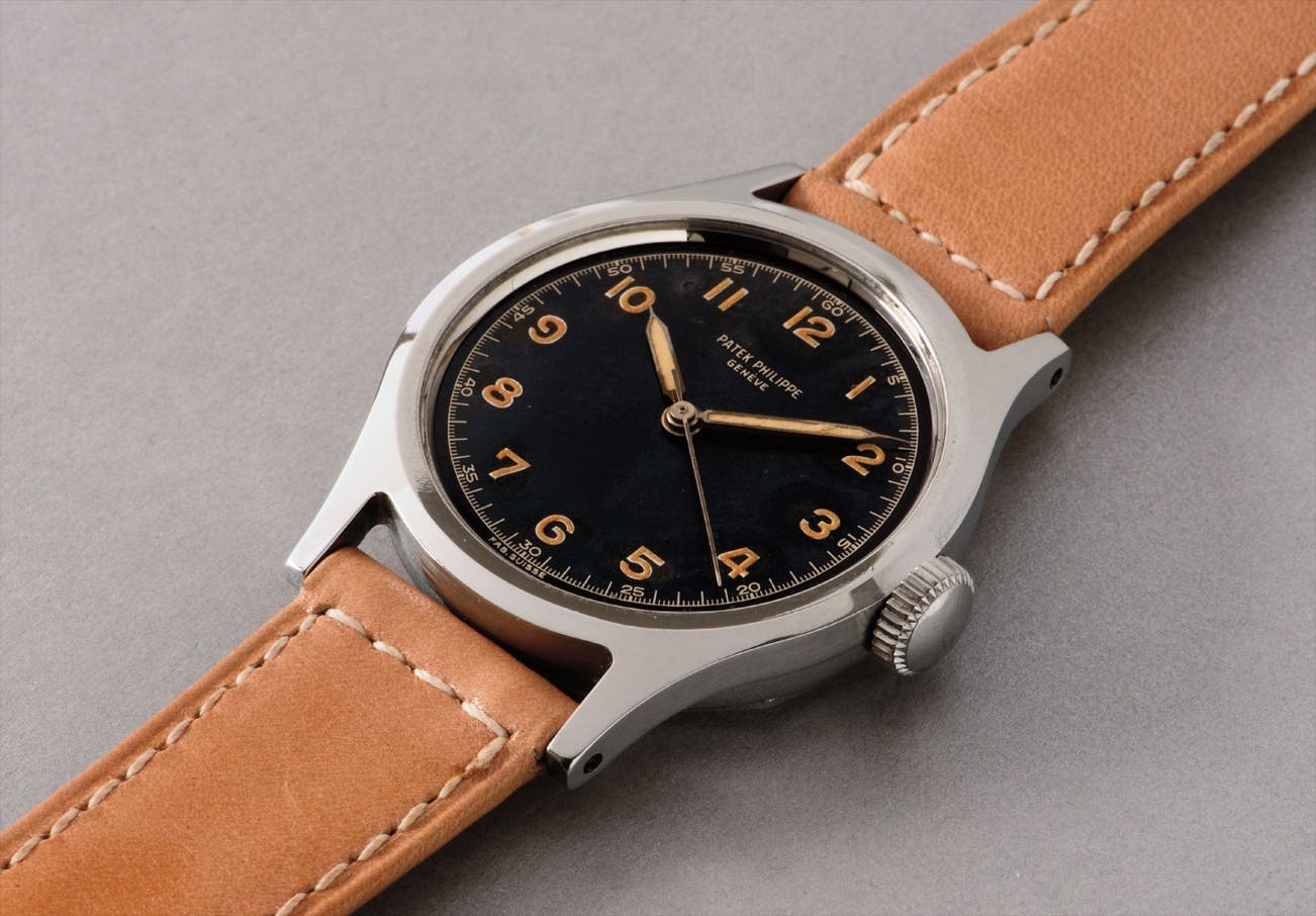 The original owner of this timepiece was a night watchman for Patek Philippe who was gifted the present watch in recognition of his work and dedication. The dial with luminous numerals and hands was clearly made for ease of use in low light during the guard's night shifts. The owner obviously took great care of his timepiece and so did his son to whom it was subsequently passed on, as it is still in impeccable condition maintaining its strong beveled lugs, polished and brushed surfaces and still features the soft inner case that protects the movement from magnetic fields. Only 17 examples of the reference 565 in steel with central seconds are known to exist and the present lot is the only one with a black dial.