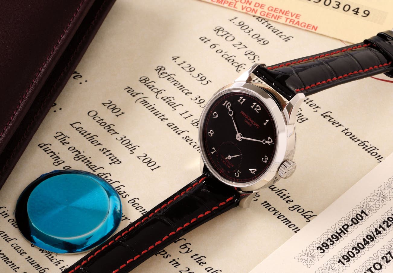 The present lot was originally born with a white dial and Breguet numerals but had the dial changed to the present with red lettering during a service at the Patek Philippe workshops in 2001 as confirmed by the Extract from the Archives. We are aware of another model with similar features (black dial and red lettering), a Patek Philippe reference 5016 and believe that the ref 5016 and the present lot were originally a set for a collector having requested the dial change.