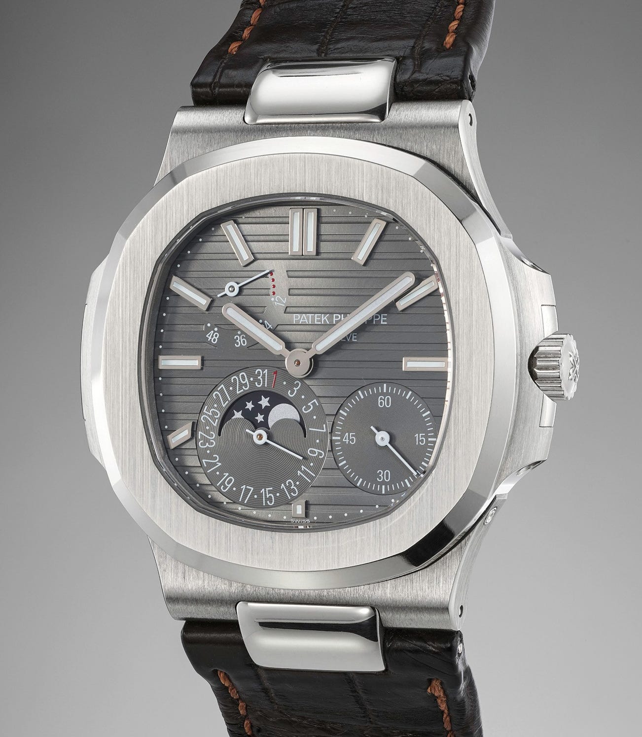 Reference 5712 was introduced in October 2006 to celebrate the 30th anniversary of the celebrated Nautilus. Still in production today, the white gold version is still available but incredibly difficult to obtain. At the time of launch, it was the most complicated Nautilus ever created. Displaying a beautiful grey dial, the white gold has an especially appealing luster and depth in color. It is a subtle, yet luxurious version of the iconic sports watch.