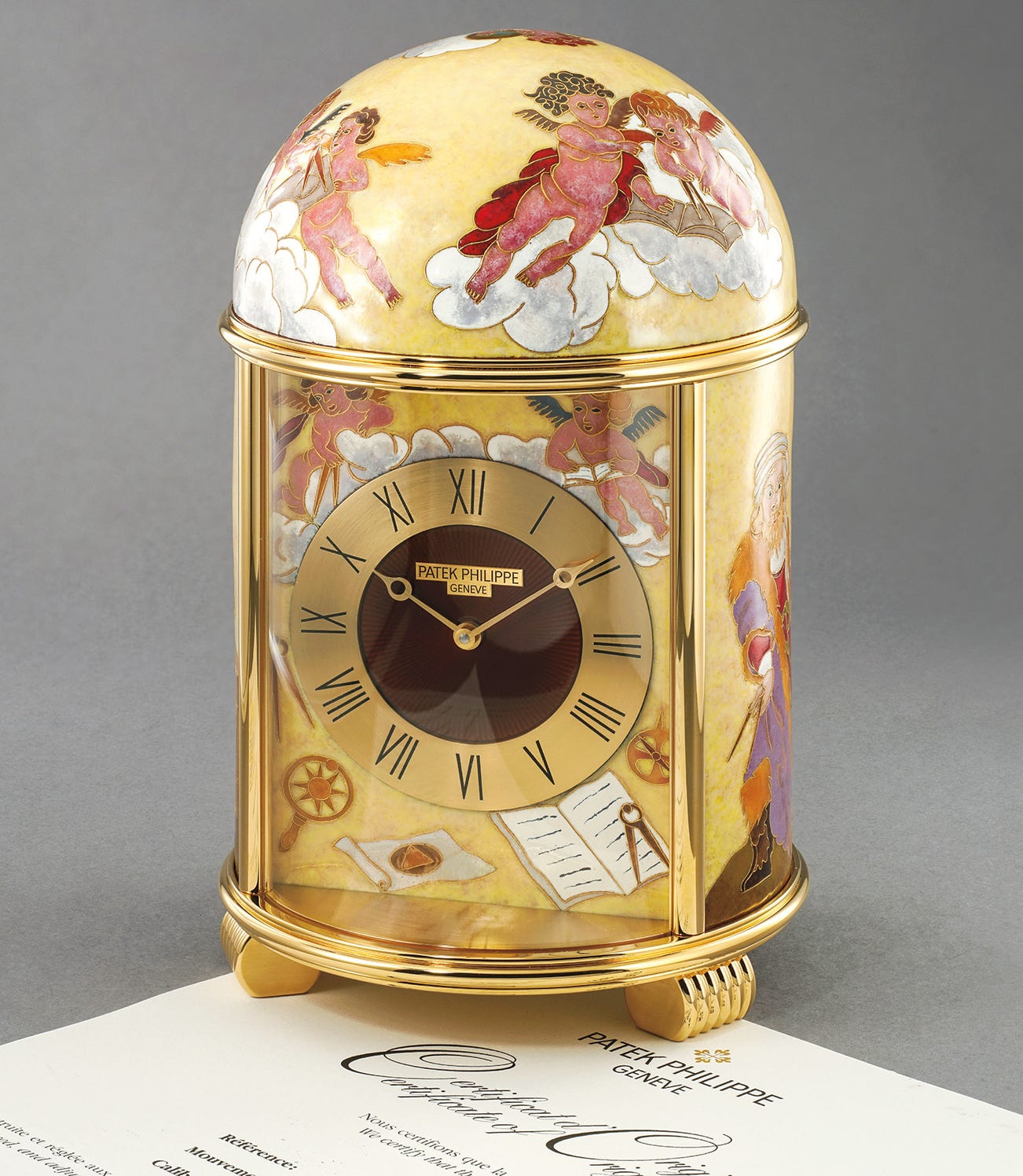 The present dome clock features the different astronomers who pioneered modern astronomy. While one panel displays Claudius Ptolemy, the other features Nicholaus Copernicus and the other Galileo Galilei. The enamel is rendered in shades of brown, pink, beige and red. The side of the dome clock is most notably signed by the enameler. It is furthermore offered with its original certificate and portfolio photograph.