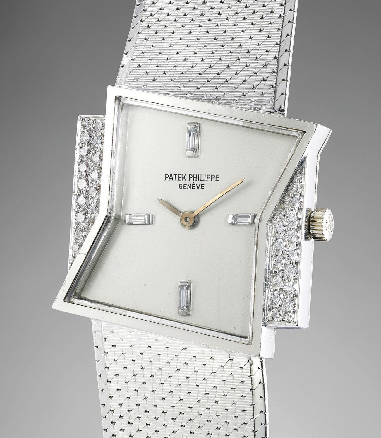 A rare and attractive white gold and diamond-set asymmetric wristwatch with bracelet