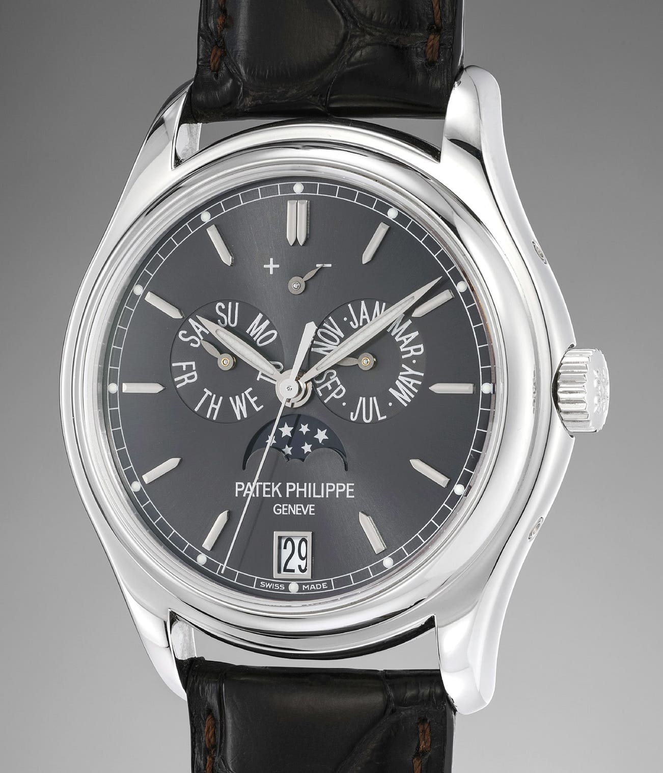 A fine and rare platinum annual calendar wristwatch with center seconds, moonphases, power reserve indication, original certificate and presentation box