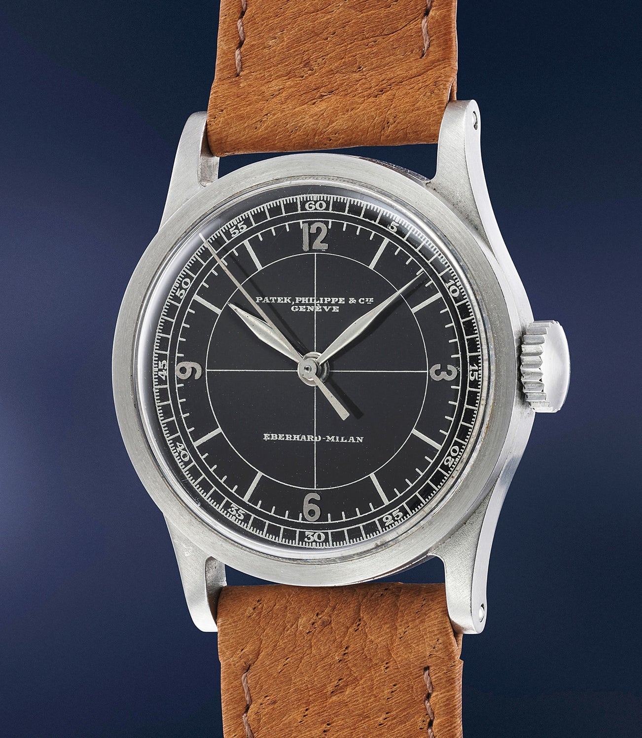 And, most obviously, it is blessed with an incredible black dial with white sectorial graphics, applied steel Arabic numerals and co-signed by Milan retailer Eberhard - all the graphic details fully confirmed by the Archives. The aesthetics and rarity of this dial would be enough to leave the most demanding collectors speechless but it furthermore arrives to this days without any kind of scratch or restoration and preserved in unparalleled condition: it would be virtually impossible to find a better preserved dial from this age.