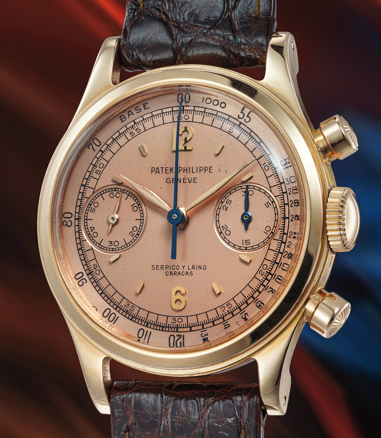 The rarity and collectability of the present watch is however a few steps beyond that of a “standard” pink gold Tasti Tondi. Indeed, it also feature a salmon dial - making this a pink-on-pink, or “PoP”, example - furthermore bearing a sublime and very notable two-tone finish. Piling onto to this already breathtaking configuration, the watch is furthermore retailed by Serpico Y Latino, as it proudly declares both with the extended signature on the dial, and also with an extremely crisp S&L monogram to the caseback. A real “tour-de-force” of rare traits that makes this example one of the most interesting 1463 to appear on the market to date and one of only 4 Serpico-retailed, two-tone PoP examples so far known.