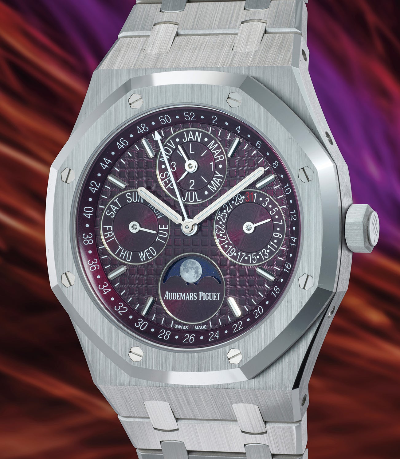 Thus, obviously, any perpetual calendar Royal Oak can be considered a dream for the watch collector, but the present piece pushes the boundaries much, much further. One of the rarest variations of the model, the present ref. 26574 in white gold features an enormously appealing and unusual plum colored dial, the deep violet hue in striking contrast with the white gold case for an absolutely spectacular final effect.