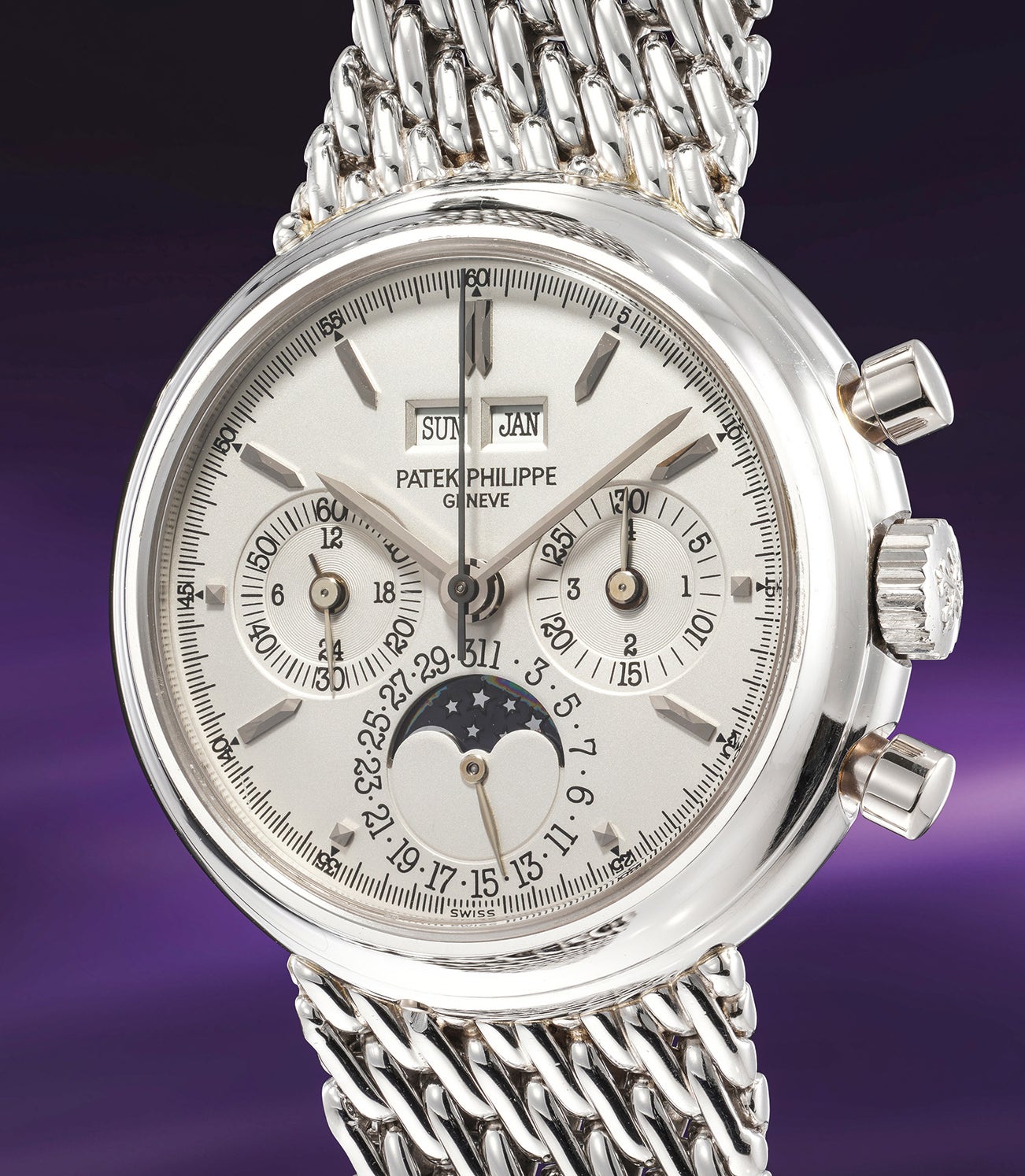 A superb, immensely attractive and equally scarce platinum chronograph wristwatch with perpetual calendar, moonphases, leap year indication, 24-hour indication, additional salmon dial with diamond-set indexes and integrated bracelet