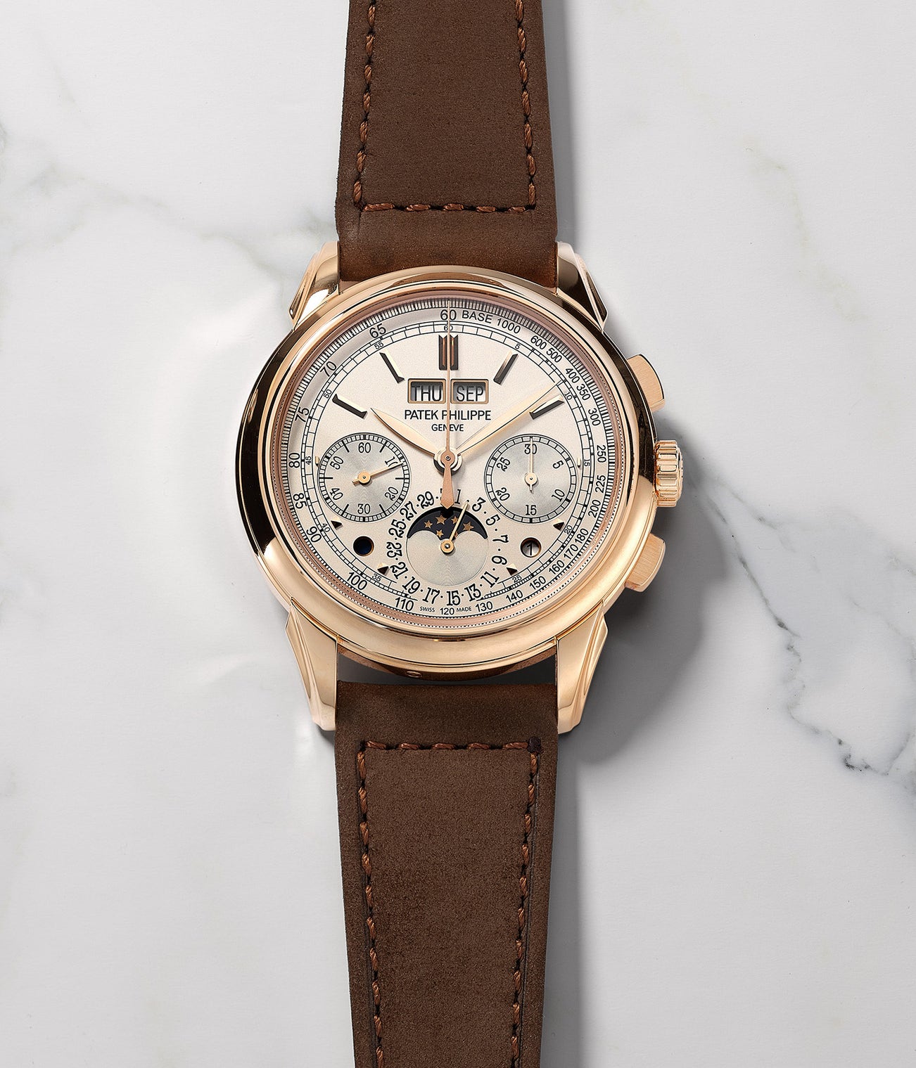 The present watch, sold in 2016, is cased in pink gold and accompanied by all its original accessories such as certificate of origin, additional case back, setting pin, product literature and presentation box. Launched in 2015, the pink gold reference 5270 notably displayed a silvered dial, and removed the "chin" detail seen on white gold versions.
