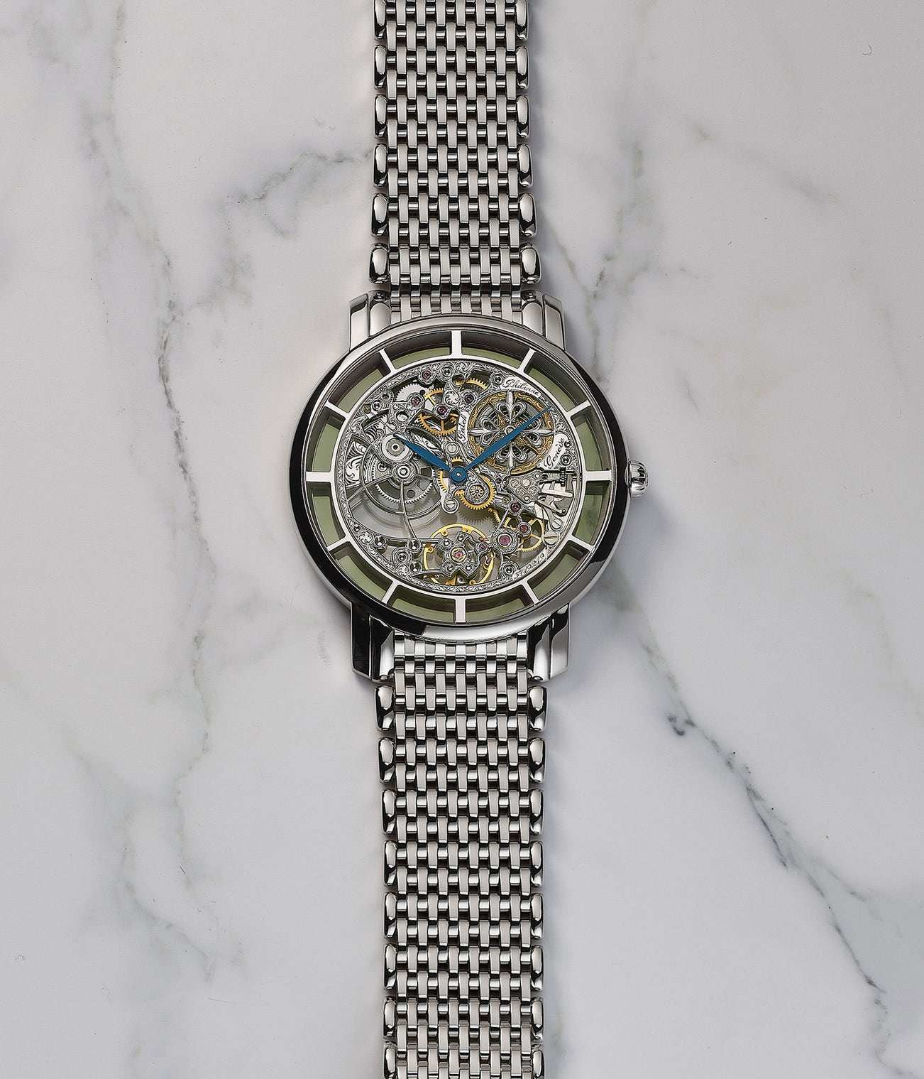 A rare and attractive white gold skeletonized wristwatch with bracelet, original certificate and presentation box