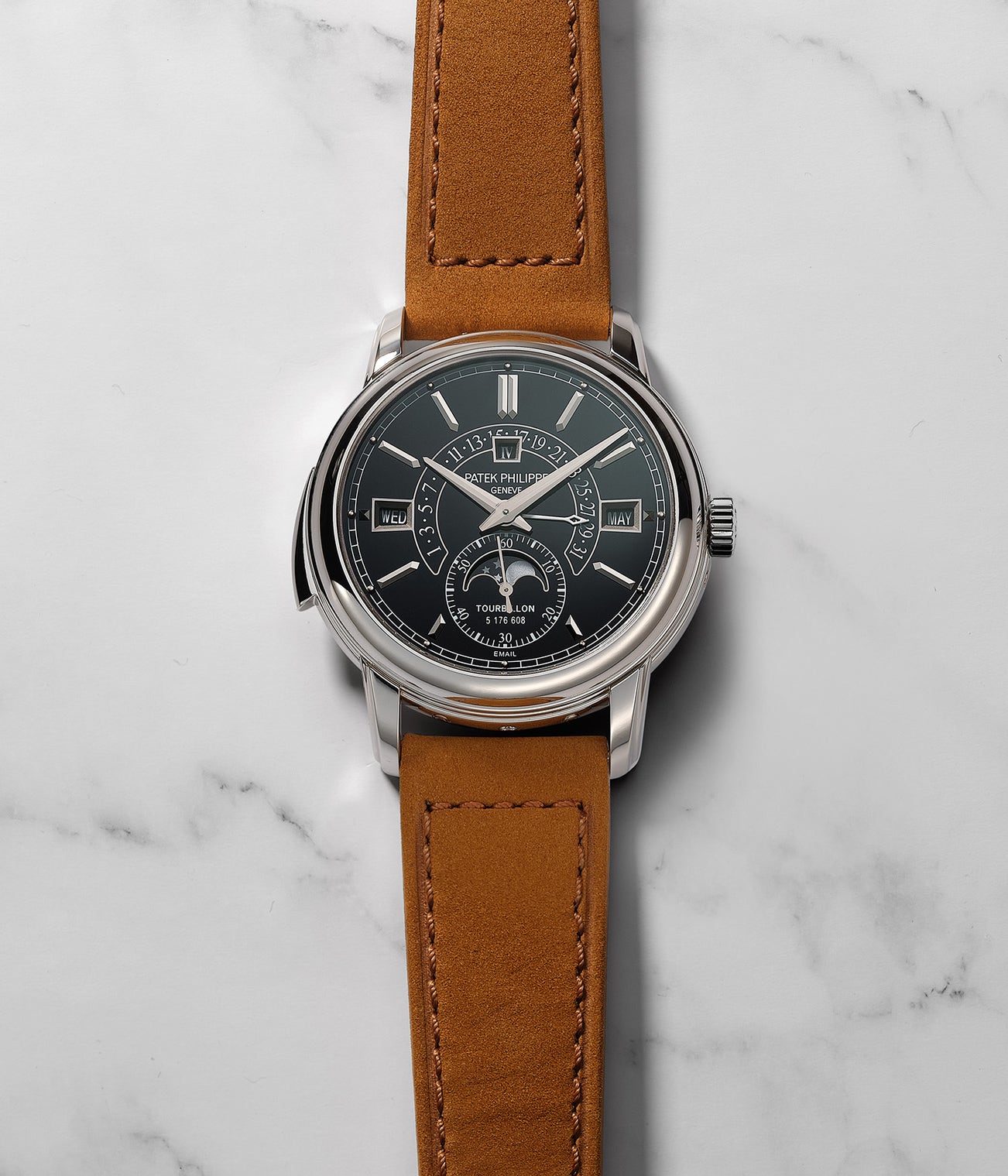 An extremely rare and important platinum minute repeating perpetual calendar enamel dial wristwatch with tourbillon, retrograde date, moon phases, additional caseback, certificate of origin and presentation box