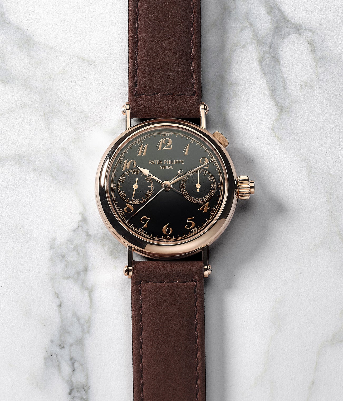 An incredibly rare and attractive pink gold split seconds chronograph wristwatch with black dial and Breguet numerals and certificate of origin